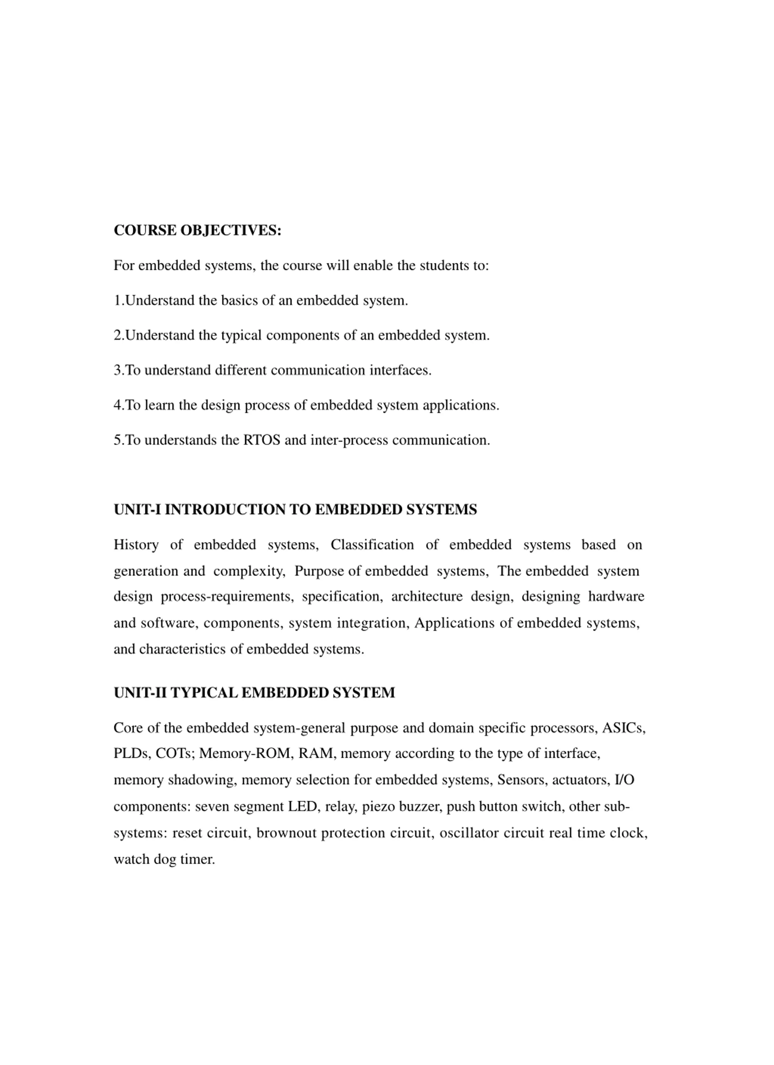 COURSE OBJECTIVES: For embedded systems, the course will enable the students to: 1.Understand the basics of an embedded system. 2.Understand the typical components of an embedded system. 3.To understand different communication interfaces. 4.To learn the design process of embedded system applications. 5.To understands the RTOS and inter-process communication. UNIT-I INTRODUCTION TO EMBEDDED SYSTEMS History of embedded systems, Classification of embedded systems based on generation and complexity, Purpose of embedded systems, The embedded system design process-requirements, specification, architecture design, designing hardware and software, components, system integration, Applications of embedded systems, and characteristics of embedded systems. UNIT-II TYPICAL EMBEDDED SYSTEM Core of the embedded system-general purpose and domain specific processors, ASICs, PLDs, COTs; Memory-ROM, RAM, memory according to the type of interface, memory shadowing, memory selection for embedded systems, Sensors, actuators, I/O components: seven segment LED, relay, piezo buzzer, push button switch, other sub- systems: reset circuit, brownout protection circuit, oscillator circuit real time clock, watch dog timer.
