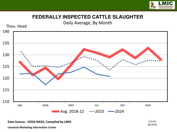 FEDERALLY INSPECTED CATTLE SLAUGHTER Daily Average, By Month Thou. Head 140 135 130 125 120 115 110 JAN MAR MAY JUL SEP NOV Avg. 2018-22 2023 2024 C-S-04 09/19/24 Data Source: USDA-NASS, Compiled by LMIC Livestock Marketing Information Center