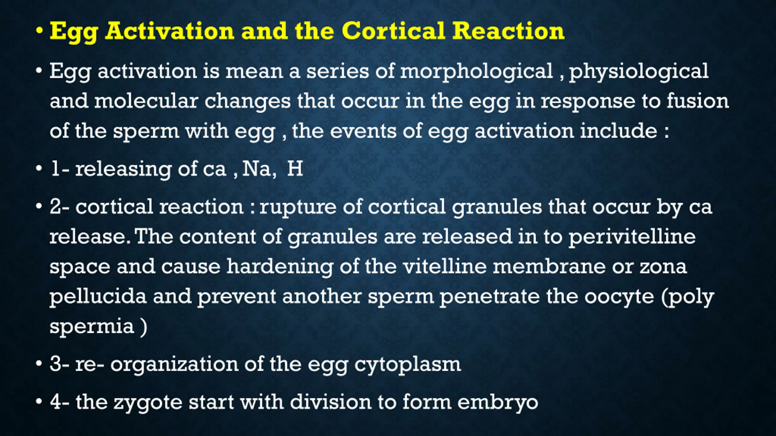 Egg Activation and the Cortical Reaction Egg activation is mean a series of morphological , physiological and molecular changes that occur in the egg in response to fusion of the sperm with egg , the events of egg activation include : 1- releasing of ca , Na, H 2- cortical reaction : rupture of cortical granules that occur by ca release. The content of granules are released in to perivitelline space and cause hardening of the vitelline membrane or zona pellucida and prevent another sperm penetrate the oocyte (poly spermia ) 3- re- organization of the egg cytoplasm 4- the zygote start with division to form embryo