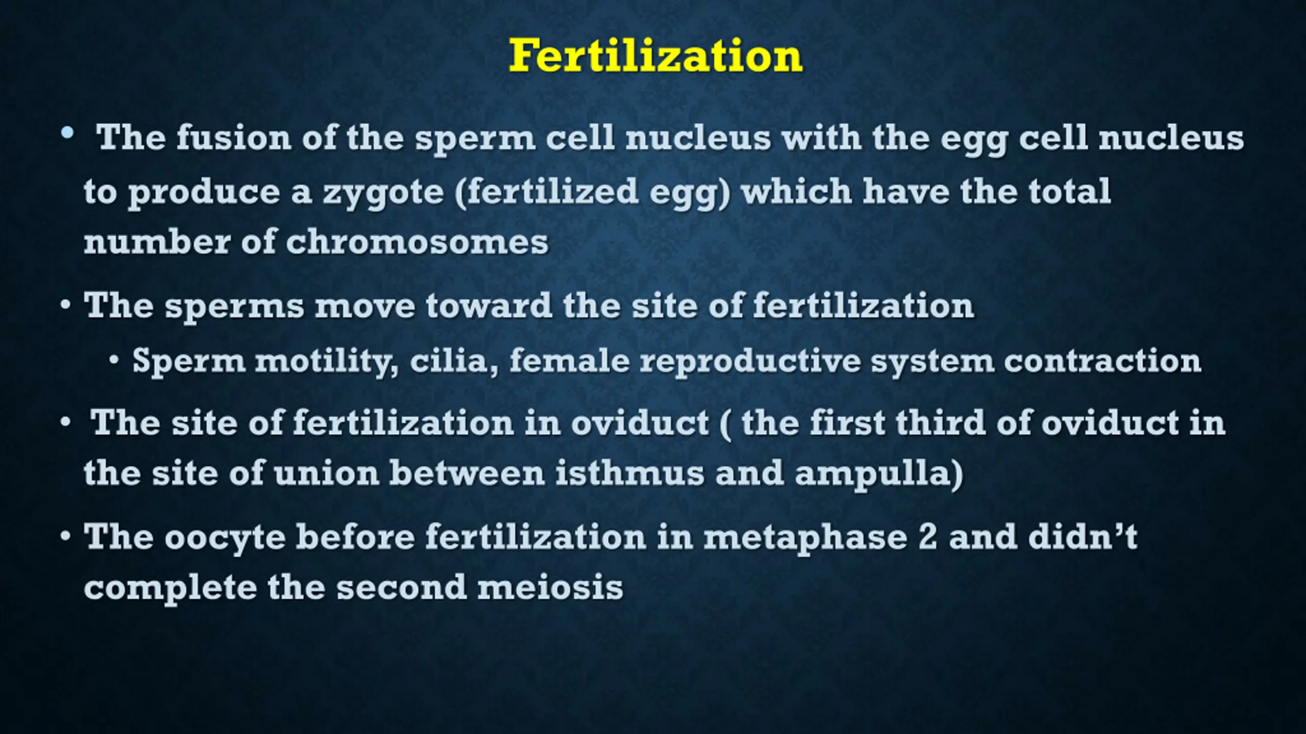 Fertilization The fusion of the sperm cell nucleus with the egg cell nucleus to produce a zygote (fertilized egg) which have the total number of chromosomes The sperms move toward the site of fertilization Sperm motility, cilia, female reproductive system contraction The site of fertilization in oviduct ( the first third of oviduct in the site of union between isthmus and ampulla) The oocyte before fertilization in metaphase 2 and didn t complete the second meiosis