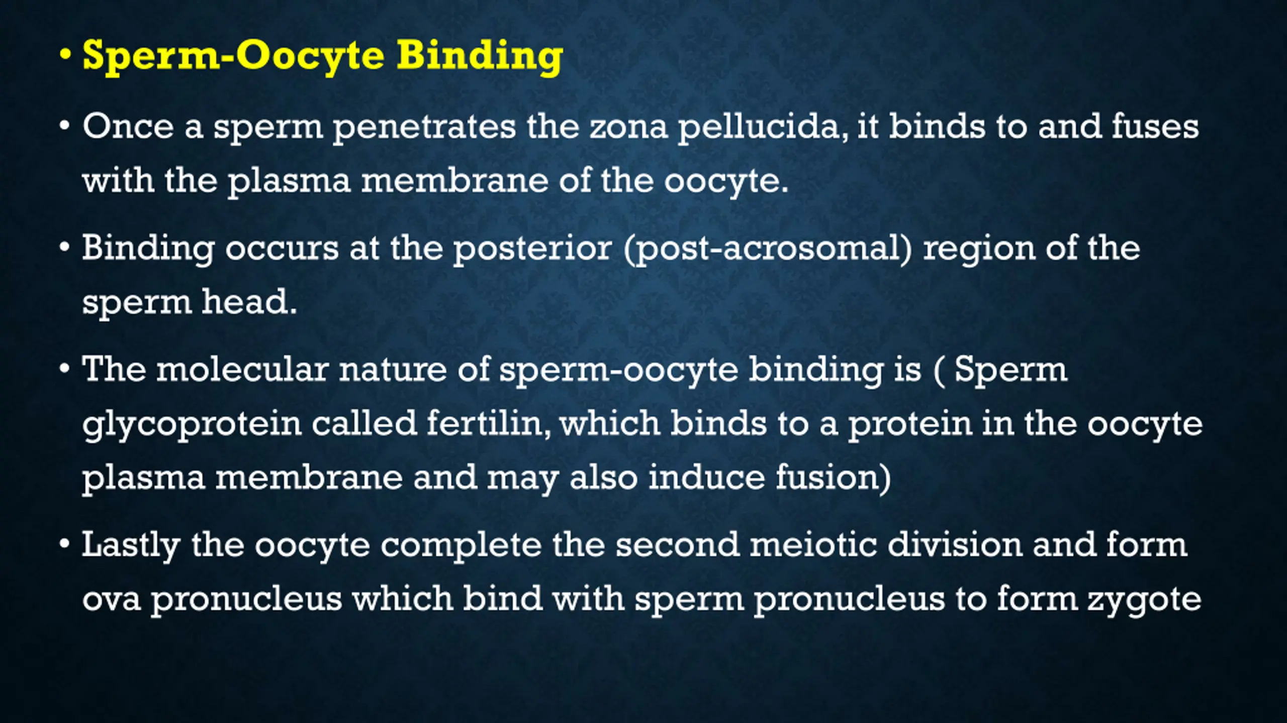 Sperm-Oocyte Binding Once a sperm penetrates the zona pellucida, it binds to and fuses with the plasma membrane of the oocyte. Binding occurs at the posterior (post-acrosomal) region of the sperm head. The molecular nature of sperm-oocyte binding is ( Sperm glycoprotein called fertilin, which binds to a protein in the oocyte plasma membrane and may also induce fusion) Lastly the oocyte complete the second meiotic division and form ova pronucleus which bind with sperm pronucleus to form zygote