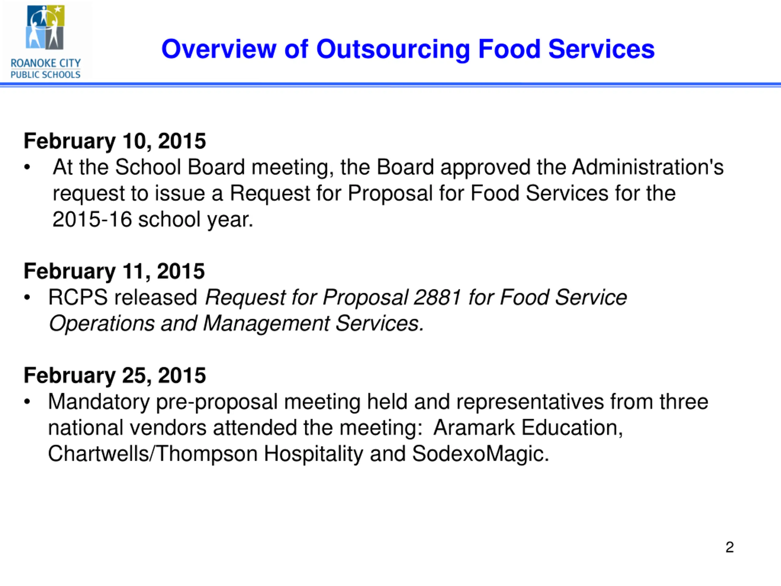 Overview of Outsourcing Food Services February 10, 2015 At the School Board meeting, the Board approved the Administration's request to issue a Request for Proposal for Food Services for the 2015-16 school year. February 11, 2015 RCPS released Request for Proposal 2881 for Food Service Operations and Management Services. February 25, 2015 Mandatory pre-proposal meeting held and representatives from three national vendors attended the meeting: Aramark Education, Chartwells/Thompson Hospitality and SodexoMagic. 2