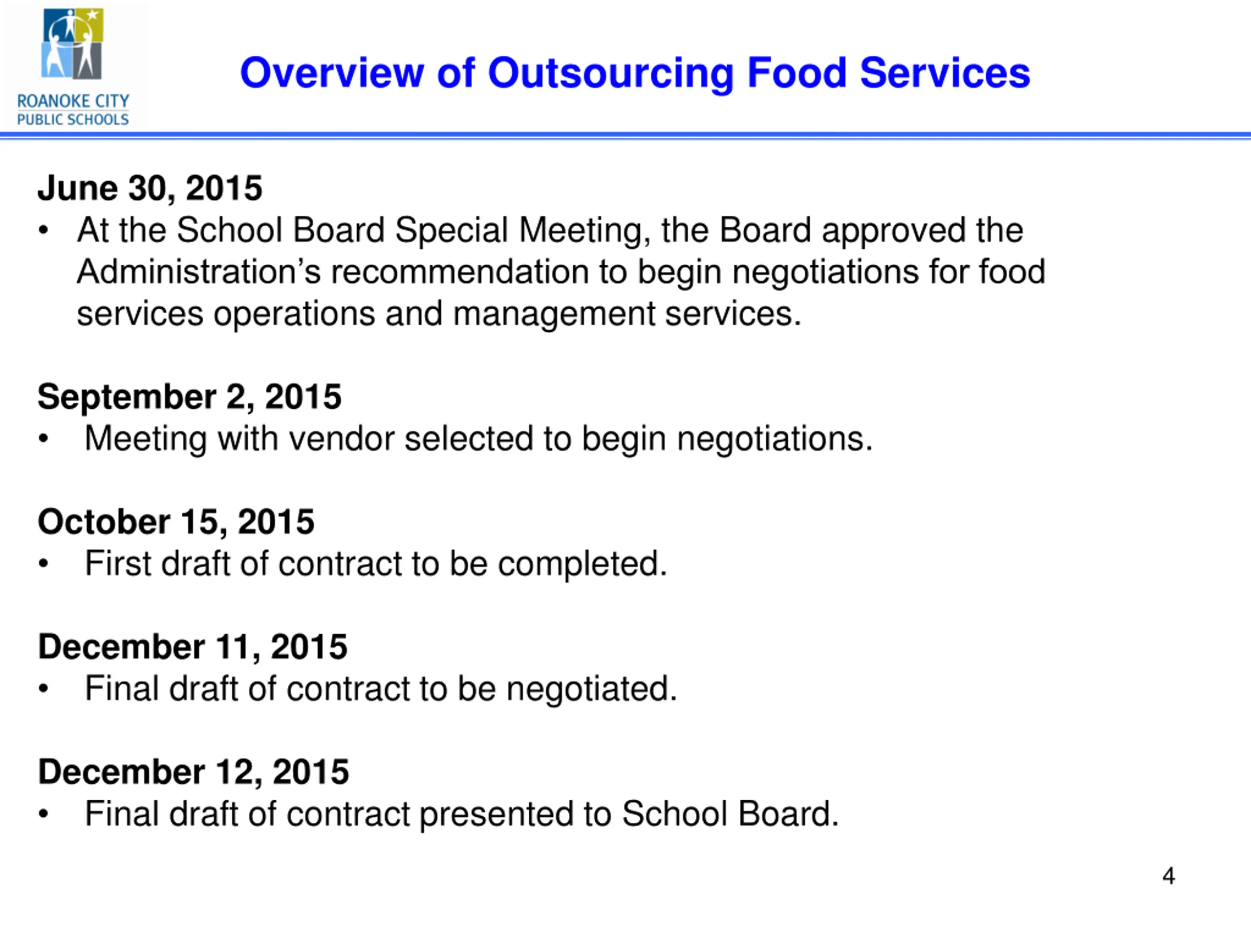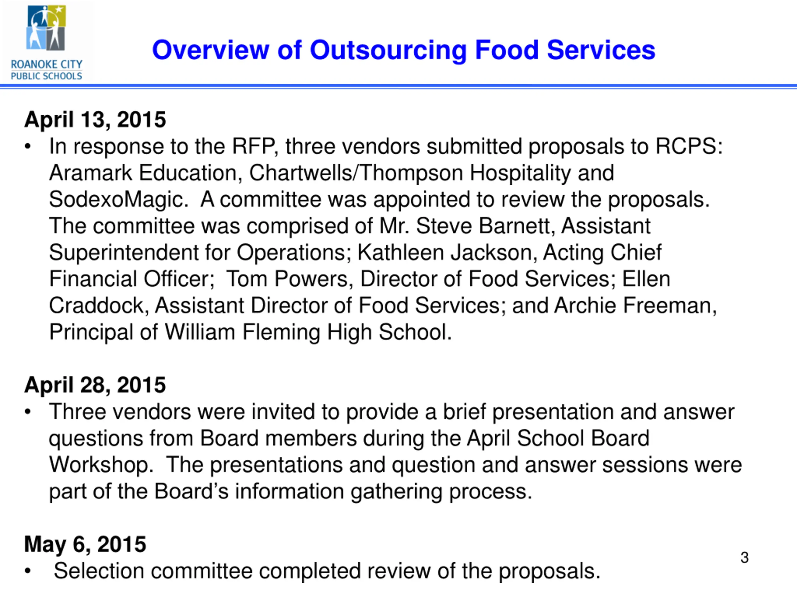 Overview of Outsourcing Food Services April 13, 2015 In response to the RFP, three vendors submitted proposals to RCPS: Aramark Education, Chartwells/Thompson Hospitality and SodexoMagic. A committee was appointed to review the proposals. The committee was comprised of Mr. Steve Barnett, Assistant Superintendent for Operations; Kathleen Jackson, Acting Chief Financial Officer; Tom Powers, Director of Food Services; Ellen Craddock, Assistant Director of Food Services; and Archie Freeman, Principal of William Fleming High School. April 28, 2015 Three vendors were invited to provide a brief presentation and answer questions from Board members during the April School Board Workshop. The presentations and question and answer sessions were part of the Board s information gathering process. May 6, 2015 Selection committee completed review of the proposals. 3
