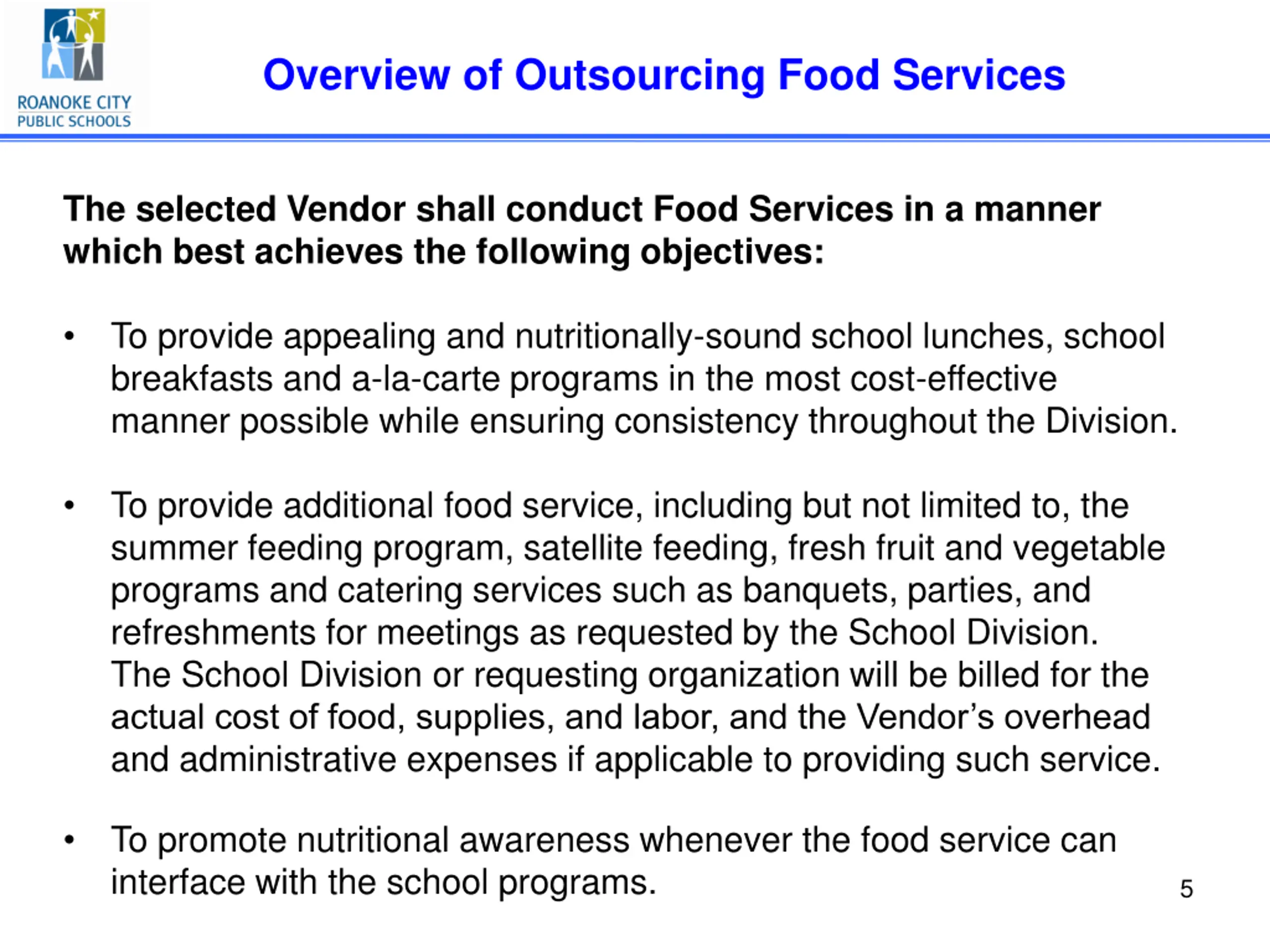 Overview of Outsourcing Food Services The selected Vendor shall conduct Food Services in a manner which best achieves the following objectives: To provide appealing and nutritionally-sound school lunches, school breakfasts and a-la-carte programs in the most cost-effective manner possible while ensuring consistency throughout the Division. To provide additional food service, including but not limited to, the summer feeding program, satellite feeding, fresh fruit and vegetable programs and catering services such as banquets, parties, and refreshments for meetings as requested by the School Division. The School Division or requesting organization will be billed for the actual cost of food, supplies, and labor, and the Vendor s overhead and administrative expenses if applicable to providing such service. To promote nutritional awareness whenever the food service can interface with the school programs. 5