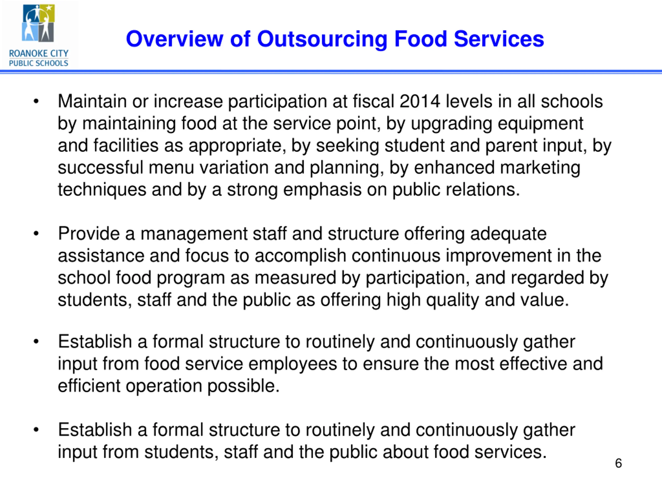 Overview of Outsourcing Food Services Maintain or increase participation at fiscal 2014 levels in all schools by maintaining food at the service point, by upgrading equipment and facilities as appropriate, by seeking student and parent input, by successful menu variation and planning, by enhanced marketing techniques and by a strong emphasis on public relations. Provide a management staff and structure offering adequate assistance and focus to accomplish continuous improvement in the school food program as measured by participation, and regarded by students, staff and the public as offering high quality and value. Establish a formal structure to routinely and continuously gather input from food service employees to ensure the most effective and efficient operation possible. Establish a formal structure to routinely and continuously gather input from students, staff and the public about food services. 6