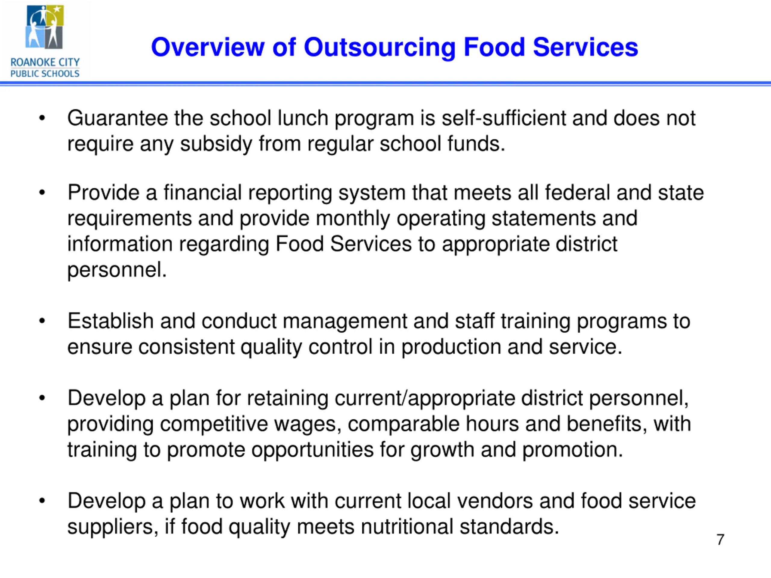 Overview of Outsourcing Food Services Guarantee the school lunch program is self-sufficient and does not require any subsidy from regular school funds. Provide a financial reporting system that meets all federal and state requirements and provide monthly operating statements and information regarding Food Services to appropriate district personnel. Establish and conduct management and staff training programs to ensure consistent quality control in production and service. Develop a plan for retaining current/appropriate district personnel, providing competitive wages, comparable hours and benefits, with training to promote opportunities for growth and promotion. Develop a plan to work with current local vendors and food service suppliers, if food quality meets nutritional standards. 7