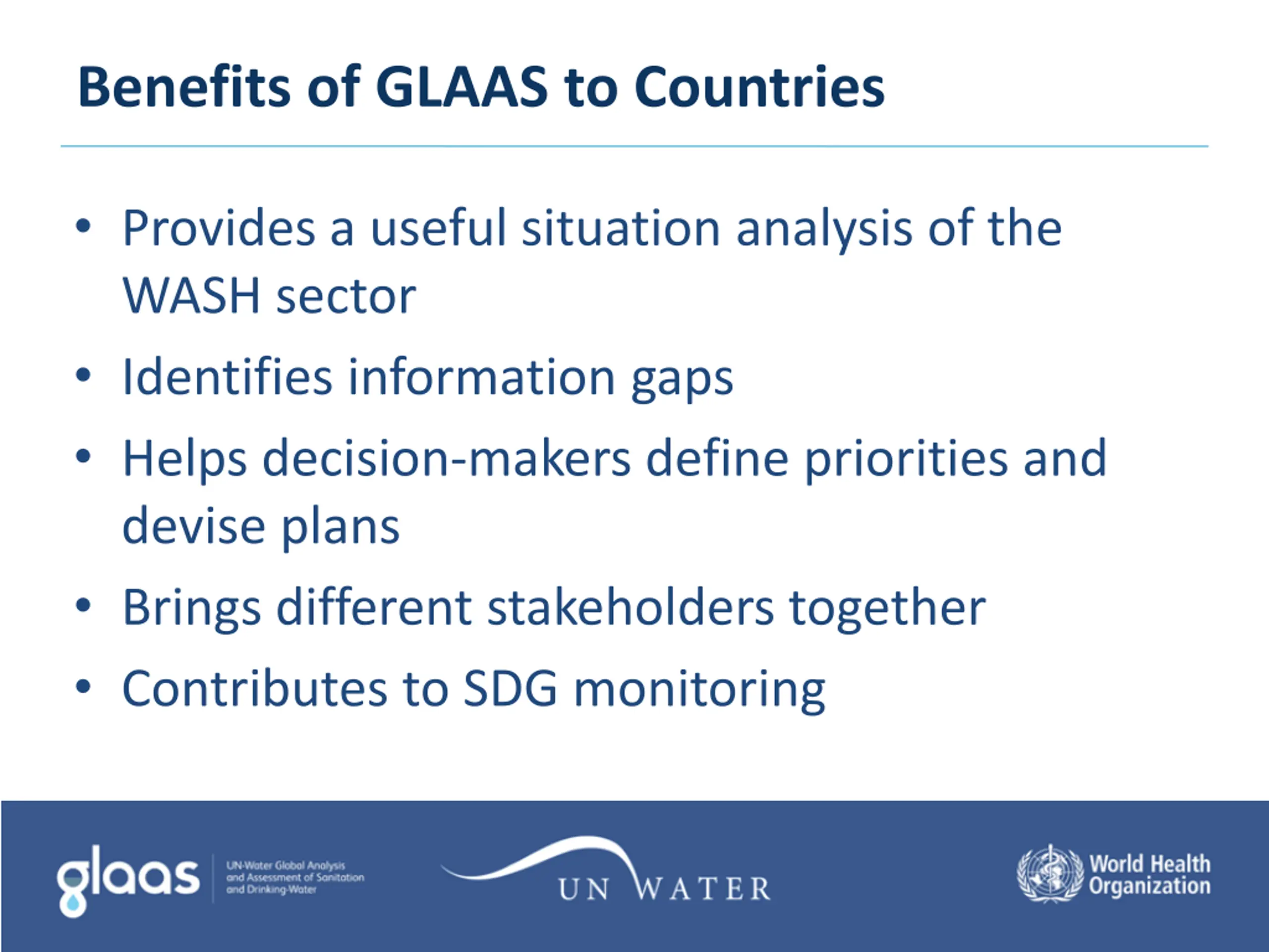 Benefits of GLAAS to Countries Provides a useful situation analysis of the WASH sector Identifies information gaps Helps decision-makers define priorities and devise plans Brings different stakeholders together Contributes to SDG monitoring