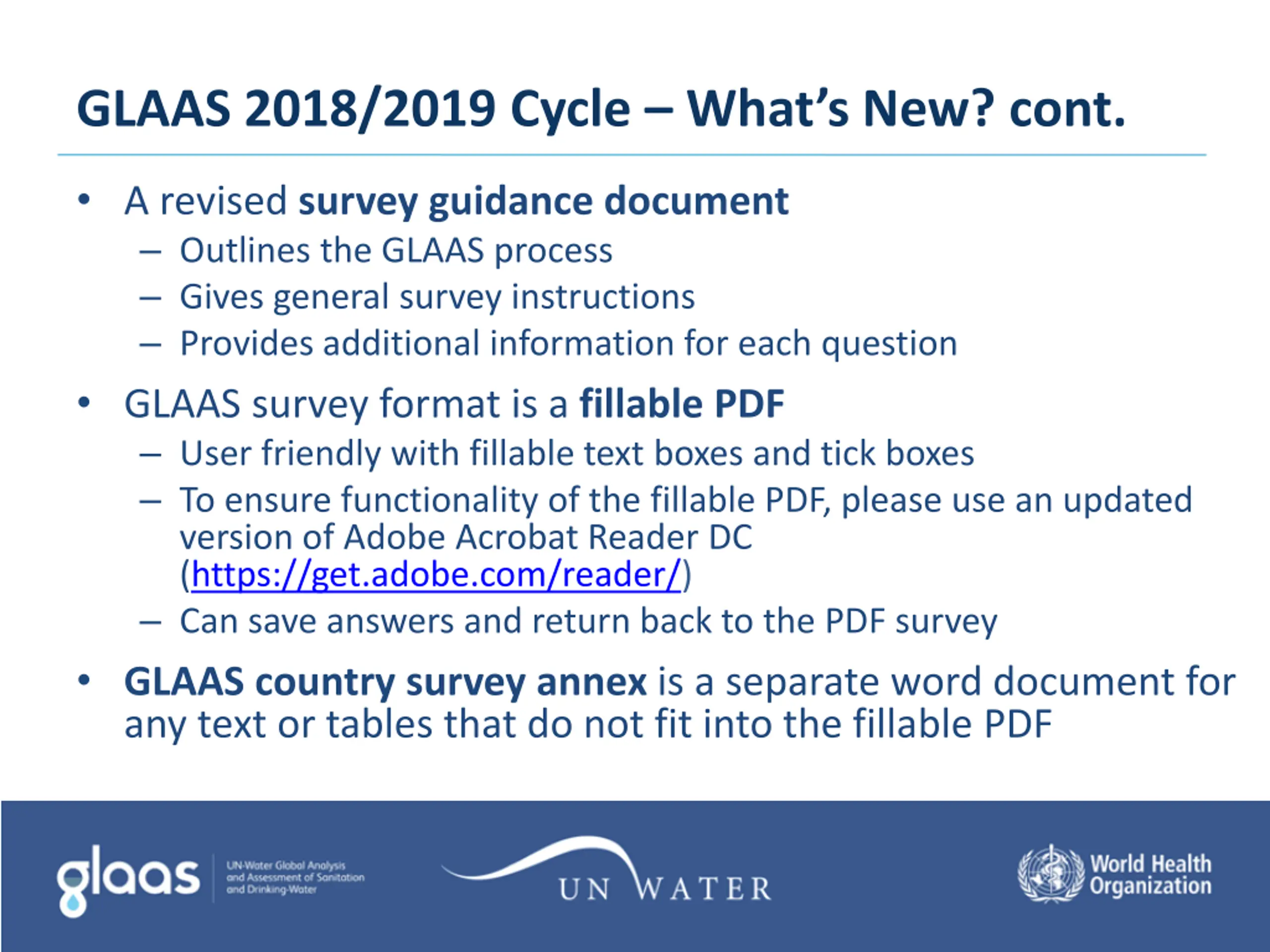 GLAAS 2018/2019 Cycle Whats New? cont. A revised survey guidance document Outlines the GLAAS process Gives general survey instructions Provides additional information for each question GLAAS survey format is a fillable PDF User friendly with fillable text boxes and tick boxes To ensure functionality of the fillable PDF, please use an updated version of Adobe Acrobat Reader DC (https://get.adobe.com/reader/) Can save answers and return back to the PDF survey GLAAS country survey annex is a separate word document for any text or tables that do not fit into the fillable PDF