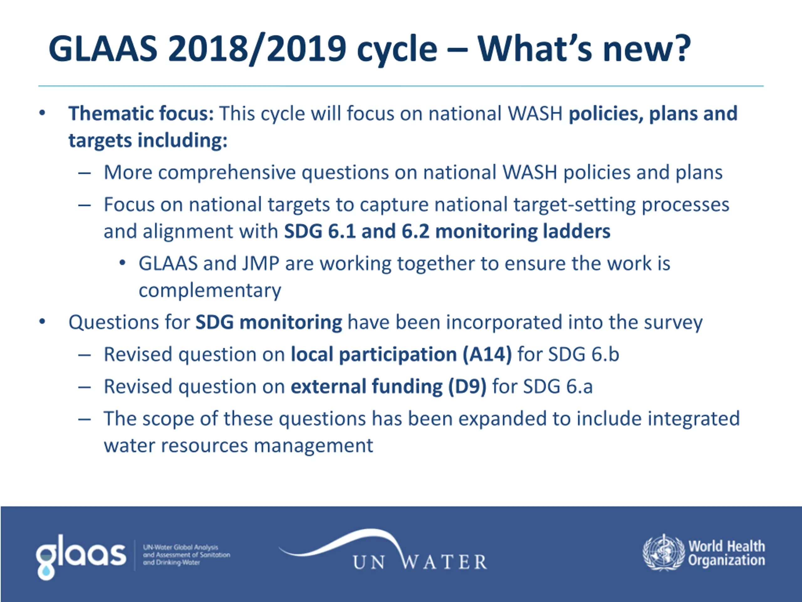 GLAAS 2018/2019 cycle Whats new? Thematic focus: This cycle will focus on national WASH policies, plans and targets including: More comprehensive questions on national WASH policies and plans Focus on national targets to capture national target-setting processes and alignment with SDG 6.1 and 6.2 monitoring ladders GLAAS and JMP are working together to ensure the work is complementary Questions for SDG monitoring have been incorporated into the survey Revised question on local participation (A14) for SDG 6.b Revised question on external funding (D9) for SDG 6.a The scope of these questions has been expanded to include integrated water resources management