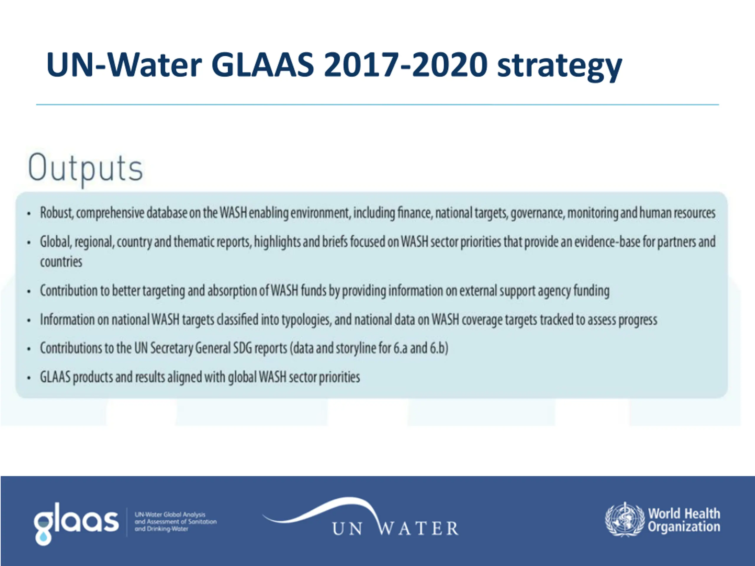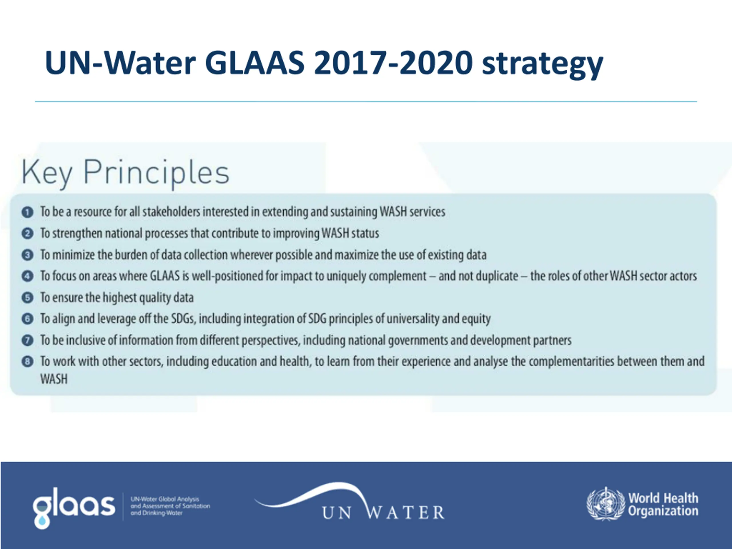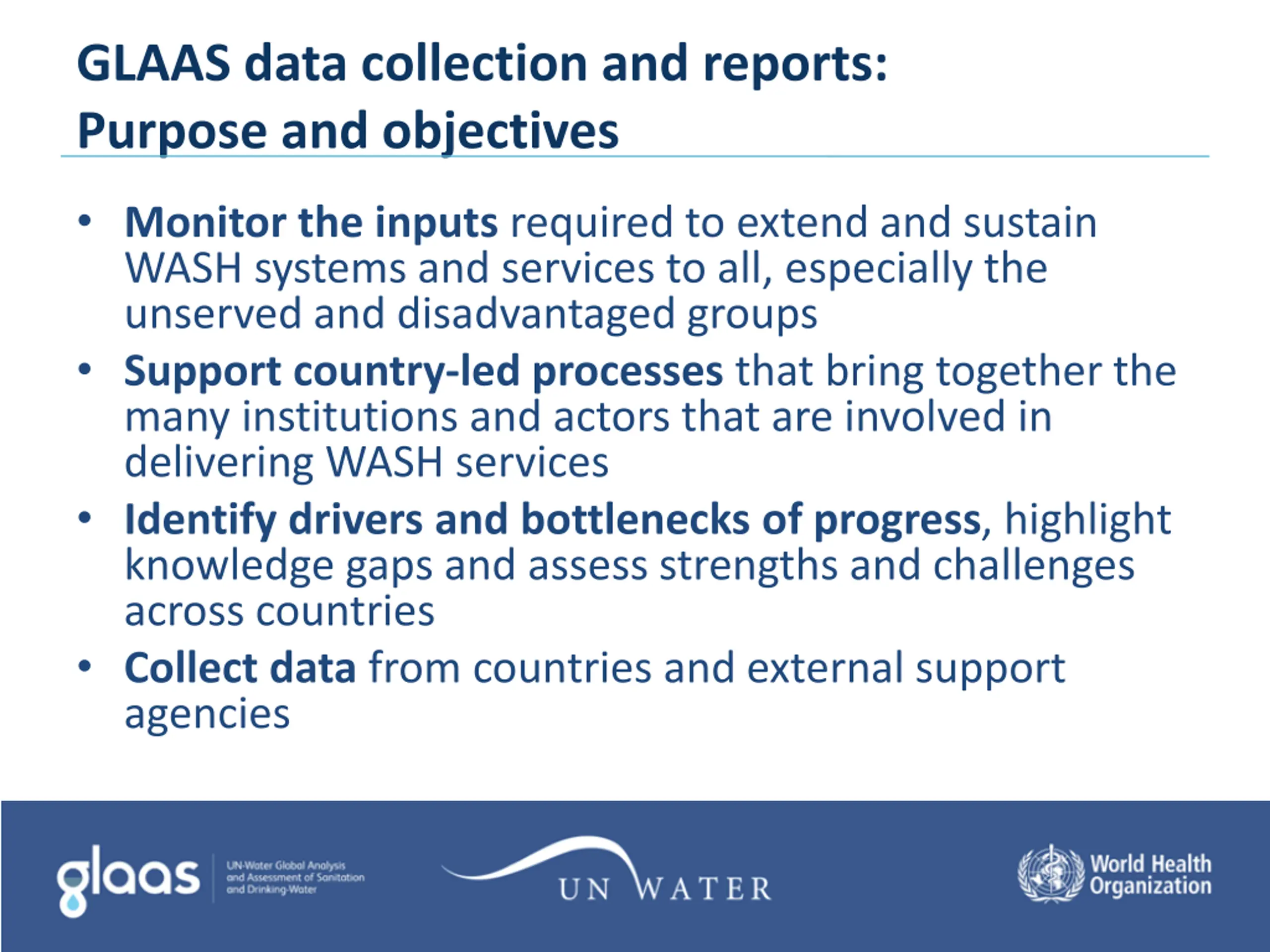 GLAAS data collection and reports: Purpose and objectives Monitor the inputs required to extend and sustain WASH systems and services to all, especially the unserved and disadvantaged groups Support country-led processes that bring together the many institutions and actors that are involved in delivering WASH services Identify drivers and bottlenecks of progress, highlight knowledge gaps and assess strengths and challenges across countries Collect data from countries and external support agencies