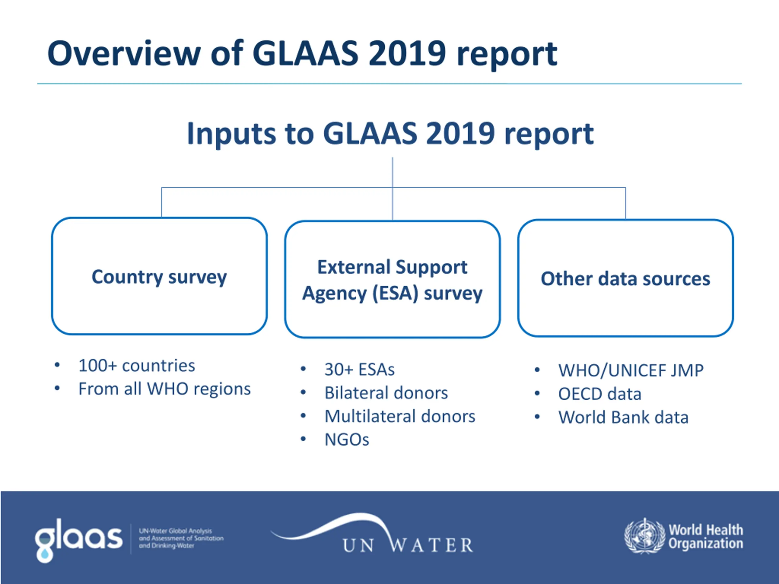 Overview of GLAAS 2019 report Inputs to GLAAS 2019 report External Support Agency (ESA) survey Country survey Other data sources 100+ countries From all WHO regions 30+ ESAs Bilateral donors Multilateral donors NGOs WHO/UNICEF JMP OECD data World Bank data