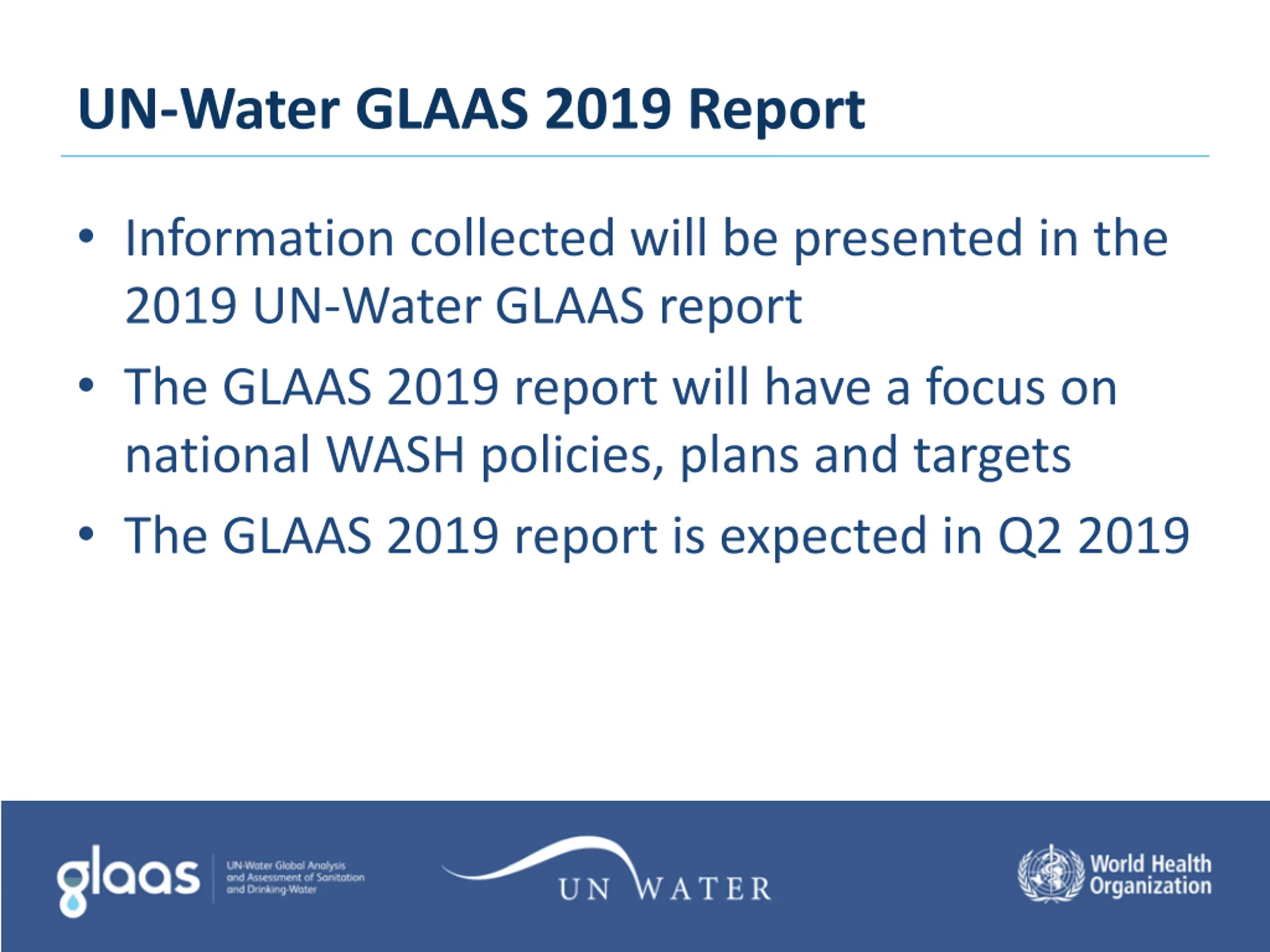 UN-Water GLAAS 2019 Report Information collected will be presented in the 2019 UN-Water GLAAS report The GLAAS 2019 report will have a focus on national WASH policies, plans and targets The GLAAS 2019 report is expected in Q2 2019