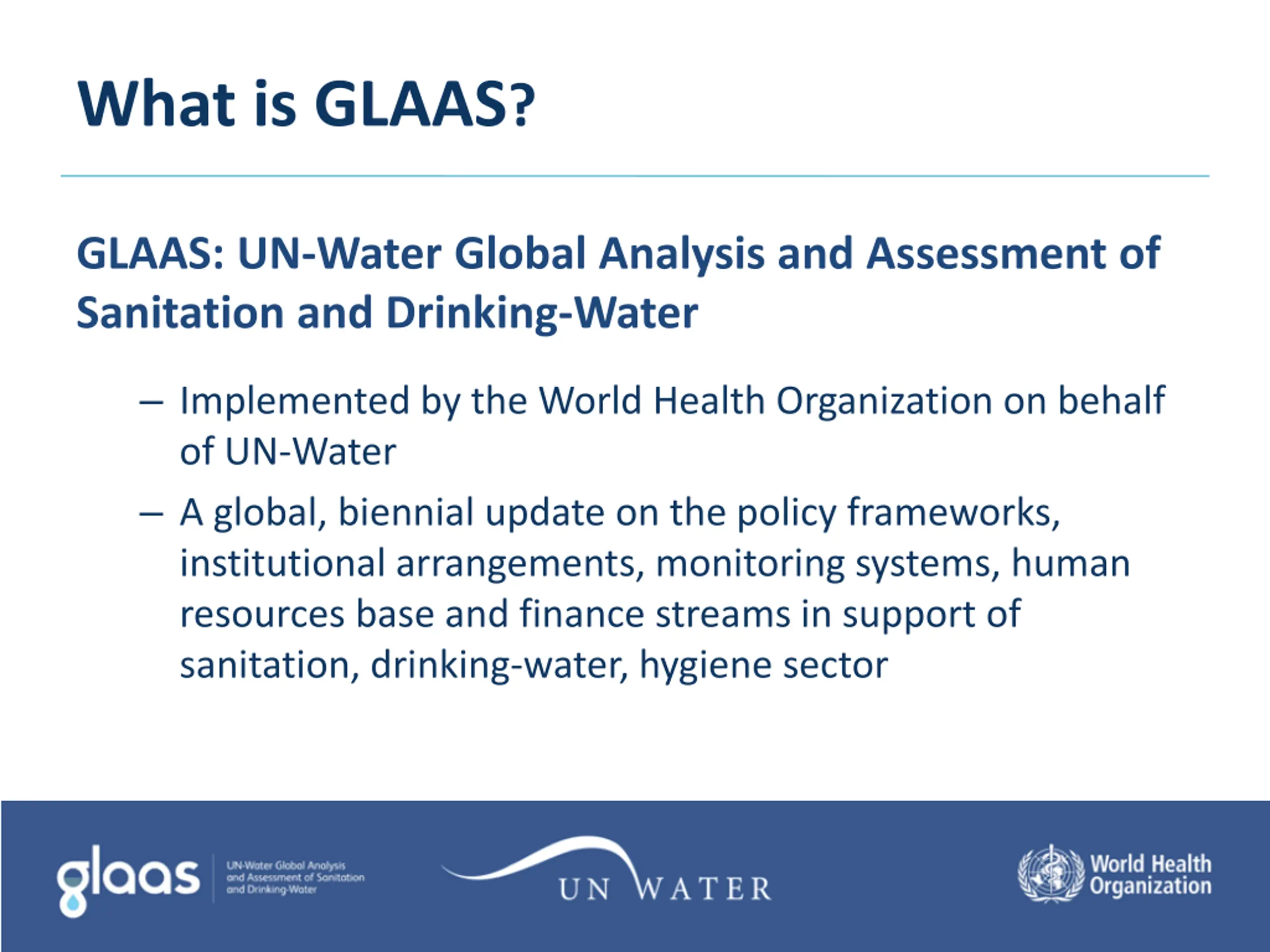 What is GLAAS? GLAAS: UN-Water Global Analysis and Assessment of Sanitation and Drinking-Water Implemented by the World Health Organization on behalf of UN-Water A global, biennial update on the policy frameworks, institutional arrangements, monitoring systems, human resources base and finance streams in support of sanitation, drinking-water, hygiene sector