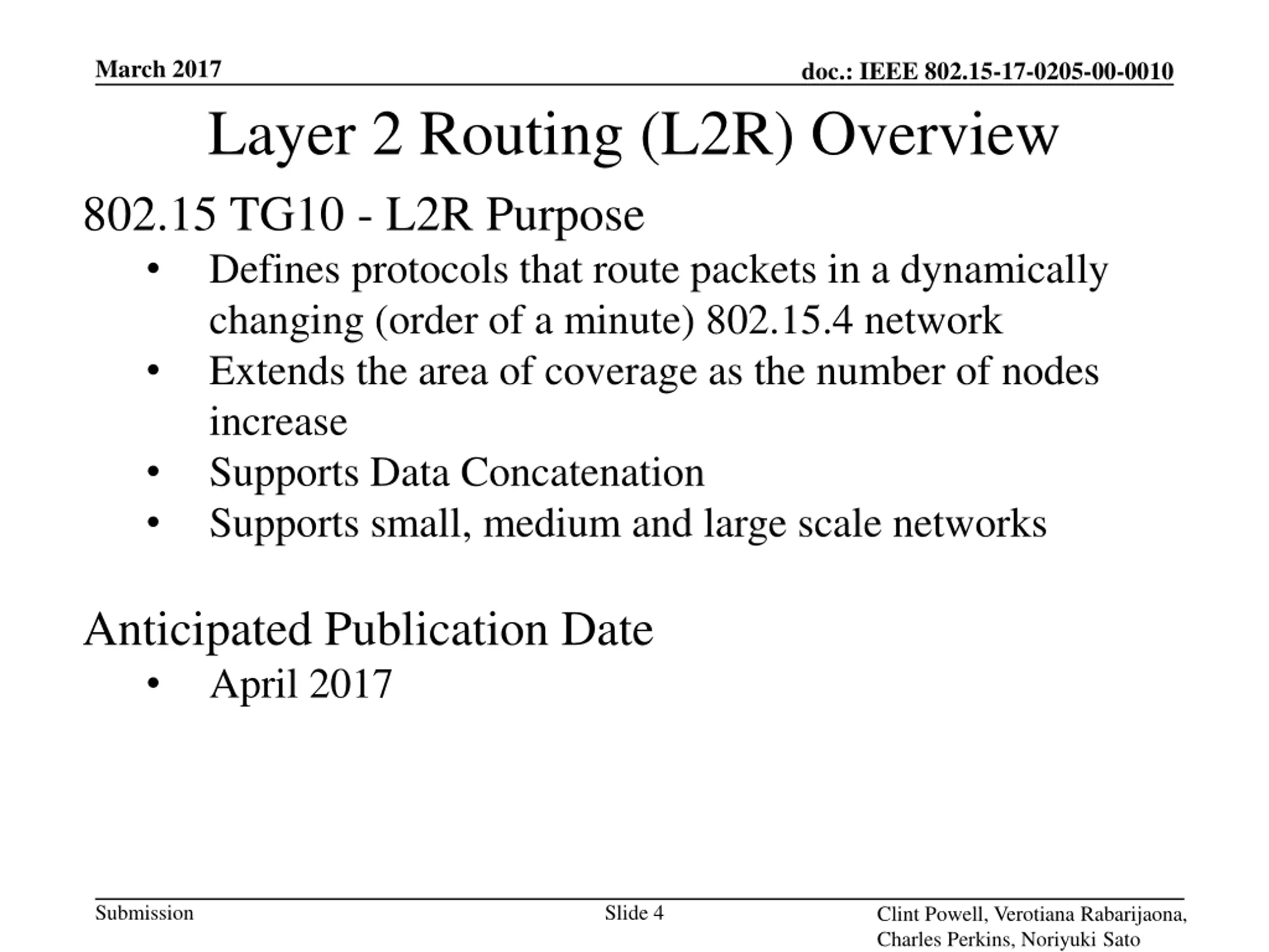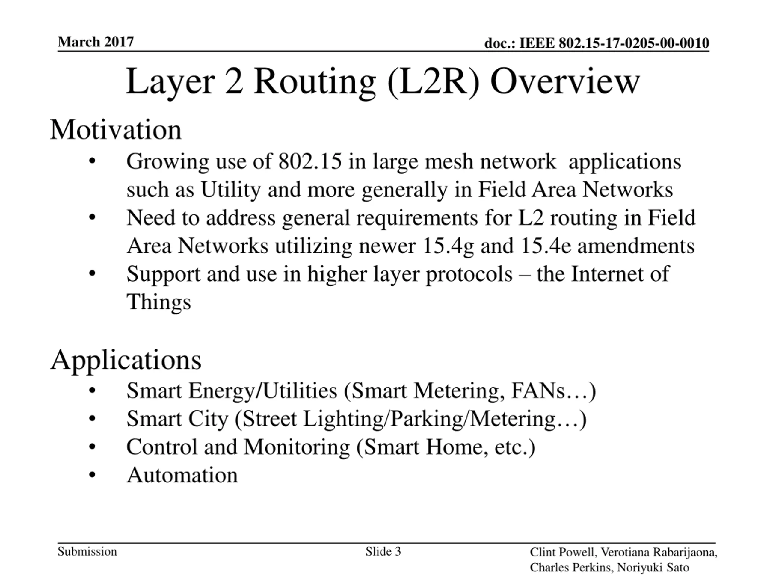 March 2017 doc.: IEEE 802.15-17-0205-00-0010 Layer 2 Routing (L2R) Overview Motivation Growing use of 802.15 in large mesh network applications such as Utility and more generally in Field Area Networks Need to address general requirements for L2 routing in Field Area Networks utilizing newer 15.4g and 15.4e amendments Support and use in higher layer protocols the Internet of Things Applications Smart Energy/Utilities (Smart Metering, FANs ) Smart City (Street Lighting/Parking/Metering ) Control and Monitoring (Smart Home, etc.) Automation Submission Slide 3 Clint Powell, Verotiana Rabarijaona, Charles Perkins, Noriyuki Sato