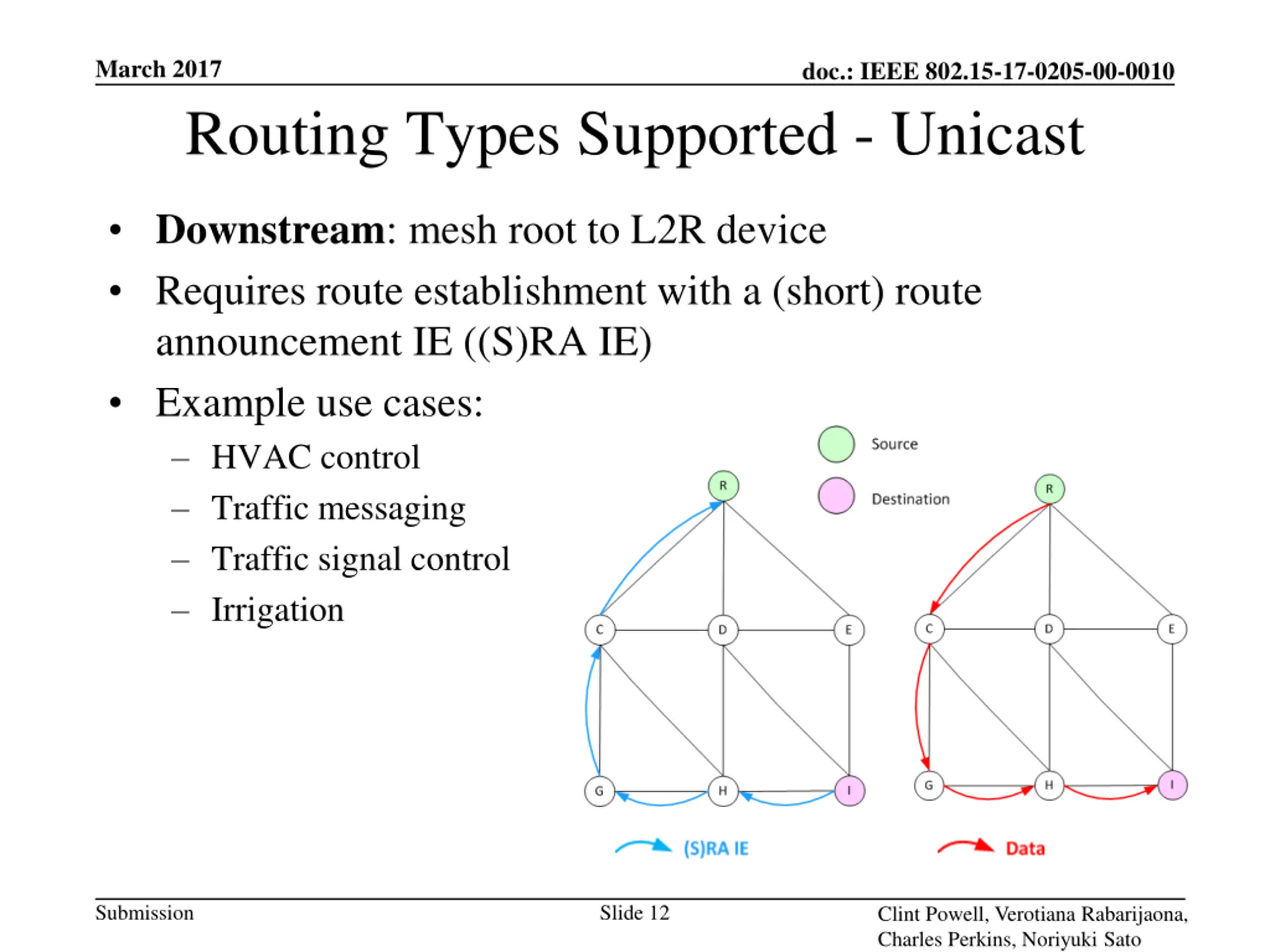March 2017 doc.: IEEE 802.15-17-0205-00-0010 Routing Types Supported - Unicast Upstream: L2R device to the mesh root Enabled as soon as a device has joined the mesh Example use cases: Infrastructure monitoring Traffic monitoring Smart meter reading HVAC monitoring Environment monitoring Agriculture monitoring Asset tracking Parking monitoring Submission Slide 11 Clint Powell, Verotiana Rabarijaona, Charles Perkins, Noriyuki Sato