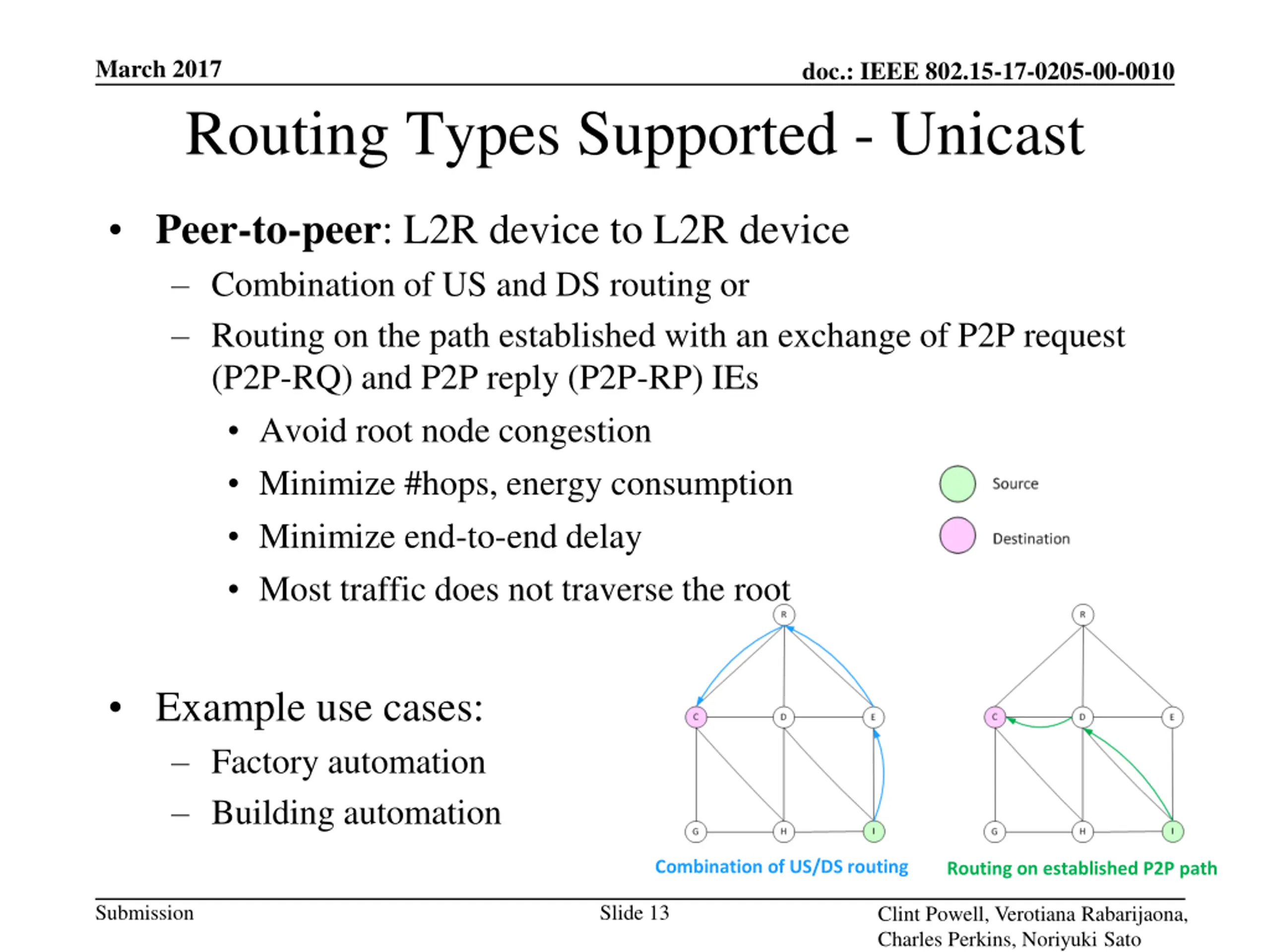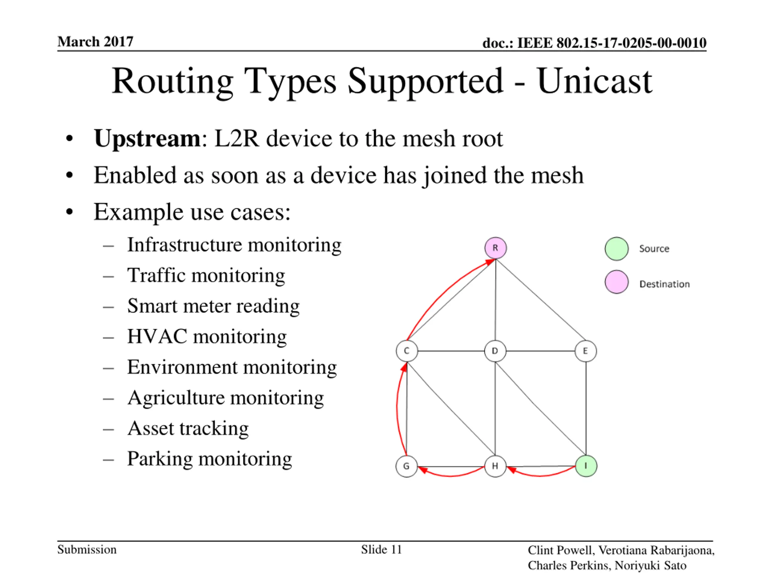 March 2017 doc.: IEEE 802.15-17-0205-00-0010 Routing Types Supported - Unicast Downstream: mesh root to L2R device Requires route establishment with a (short) route announcement IE ((S)RA IE) Example use cases: HVAC control Traffic messaging Traffic signal control Irrigation Submission Slide 12 Clint Powell, Verotiana Rabarijaona, Charles Perkins, Noriyuki Sato