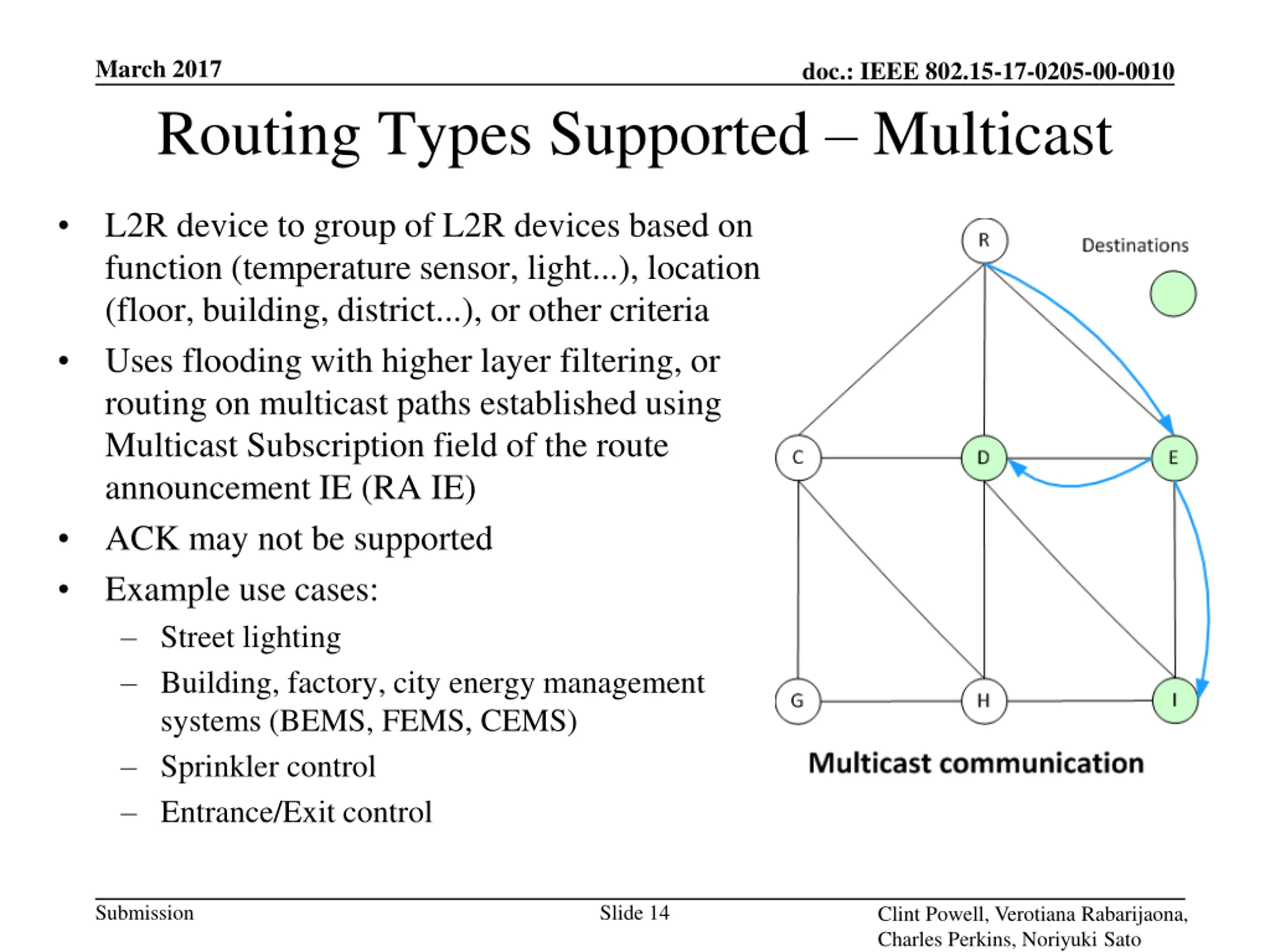 March 2017 doc.: IEEE 802.15-17-0205-00-0010 Routing Types Supported - Unicast Peer-to-peer: L2R device to L2R device Combination of US and DS routing or Routing on the path established with an exchange of P2P request (P2P-RQ) and P2P reply (P2P-RP) IEs Avoid root node congestion Minimize #hops, energy consumption Minimize end-to-end delay Most traffic does not traverse the root Example use cases: Factory automation Building automation Combination of US/DS routing Routing on established P2P path Submission Slide 13 Clint Powell, Verotiana Rabarijaona, Charles Perkins, Noriyuki Sato