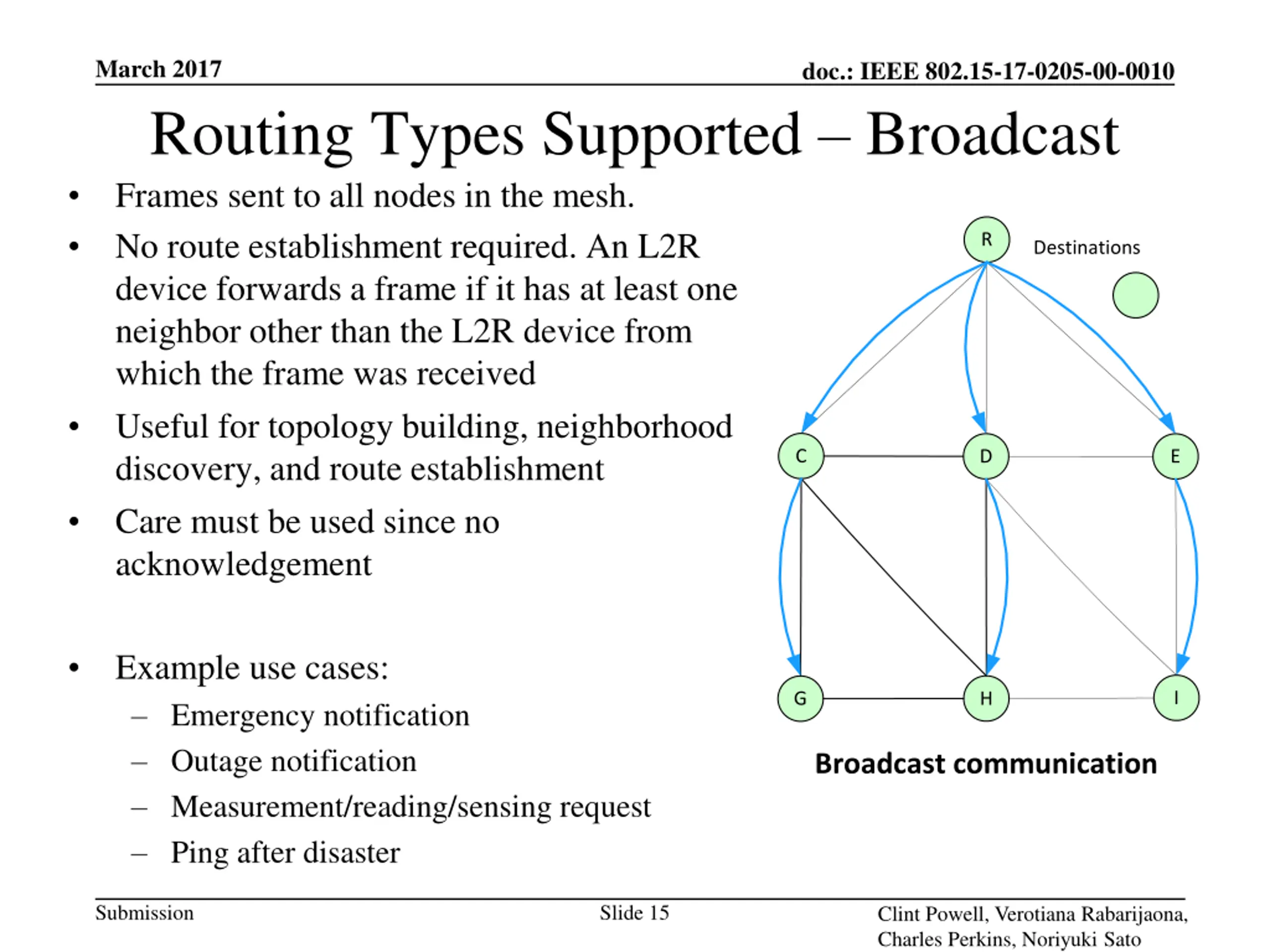 March 2017 doc.: IEEE 802.15-17-0205-00-0010 Routing Types Supported Broadcast Frames sent to all nodes in the mesh. No route establishment required. An L2R device forwards a frame if it has at least one neighbor other than the L2R device from which the frame was received Useful for topology building, neighborhood discovery, and route establishment Care must be used since no acknowledgement R Destinations C D E Example use cases: Emergency notification Outage notification Measurement/reading/sensing request Ping after disaster I H G Broadcast communication Submission Slide 15 Clint Powell, Verotiana Rabarijaona, Charles Perkins, Noriyuki Sato