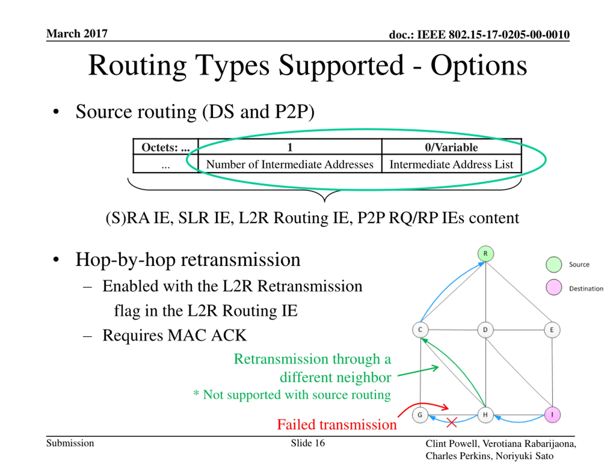 March 2017 doc.: IEEE 802.15-17-0205-00-0010 Routing Types Supported - Options Source routing (DS and P2P) Octets: ... ... 1 0/Variable Number of Intermediate Addresses Intermediate Address List (S)RA IE, SLR IE, L2R Routing IE, P2P RQ/RP IEs content Hop-by-hop retransmission Enabled with the L2R Retransmission flag in the L2R Routing IE Requires MAC ACK Retransmission through a different neighbor * Not supported with source routing Failed transmission Submission Slide 16 Clint Powell, Verotiana Rabarijaona, Charles Perkins, Noriyuki Sato
