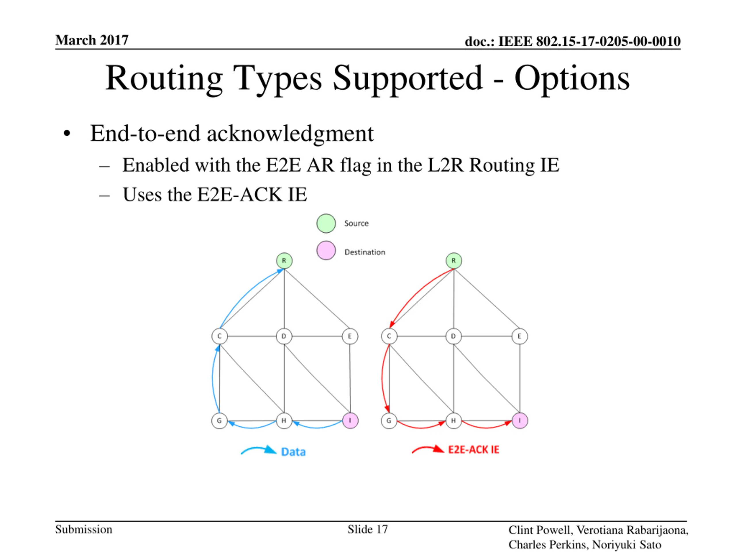 March 2017 doc.: IEEE 802.15-17-0205-00-0010 Routing Types Supported - Options End-to-end acknowledgment Enabled with the E2E AR flag in the L2R Routing IE Uses the E2E-ACK IE Submission Slide 17 Clint Powell, Verotiana Rabarijaona, Charles Perkins, Noriyuki Sato