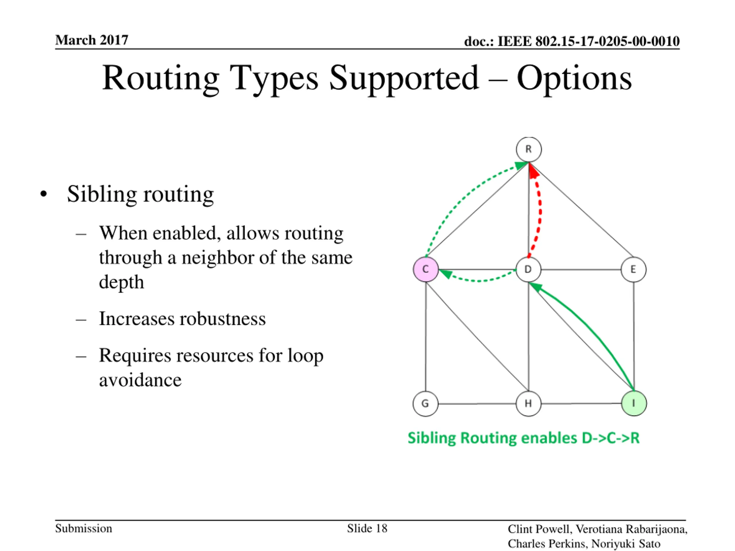 March 2017 doc.: IEEE 802.15-17-0205-00-0010 Routing Types Supported Options Sibling routing When enabled, allows routing through a neighbor of the same depth Increases robustness Requires resources for loop avoidance Submission Slide 18 Clint Powell, Verotiana Rabarijaona, Charles Perkins, Noriyuki Sato