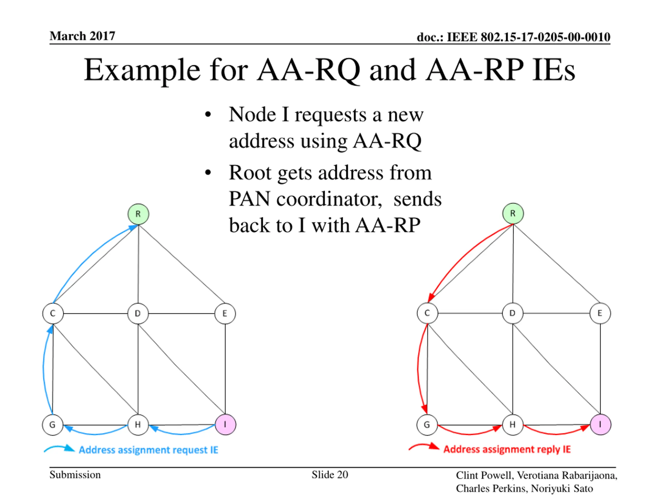 March 2017 doc.: IEEE 802.15-17-0205-00-0010 Example for AA-RQ and AA-RP IEs Node I requests a new address using AA-RQ Root gets address from PAN coordinator, sends back to I with AA-RP Submission Slide 20 Clint Powell, Verotiana Rabarijaona, Charles Perkins, Noriyuki Sato