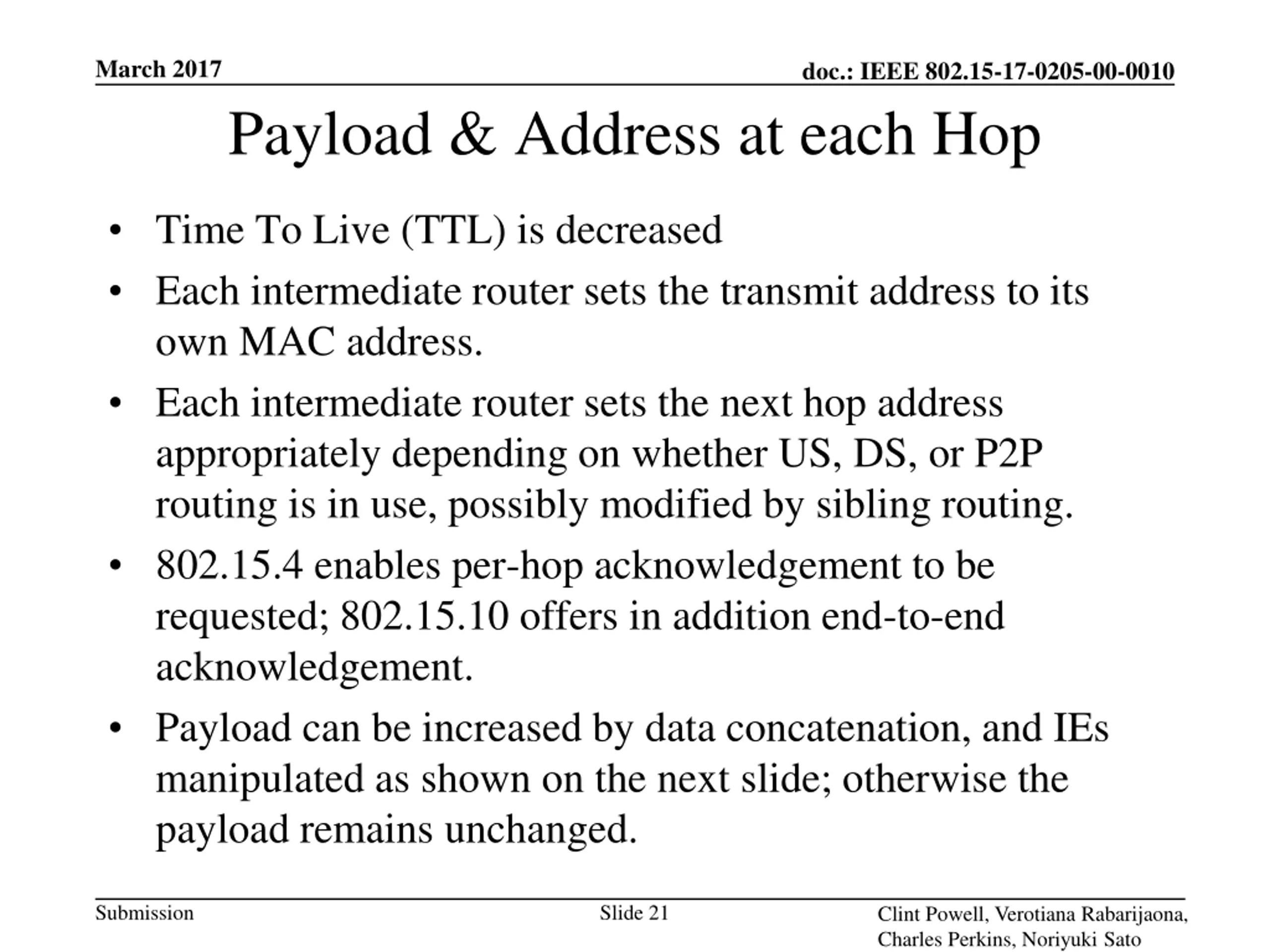 March 2017 doc.: IEEE 802.15-17-0205-00-0010 Payload & Address at each Hop Time To Live (TTL) is decreased Each intermediate router sets the transmit address to its own MAC address. Each intermediate router sets the next hop address appropriately depending on whether US, DS, or P2P routing is in use, possibly modified by sibling routing. 802.15.4 enables per-hop acknowledgement to be requested; 802.15.10 offers in addition end-to-end acknowledgement. Payload can be increased by data concatenation, and IEs manipulated as shown on the next slide; otherwise the payload remains unchanged. Submission Slide 21 Clint Powell, Verotiana Rabarijaona, Charles Perkins, Noriyuki Sato
