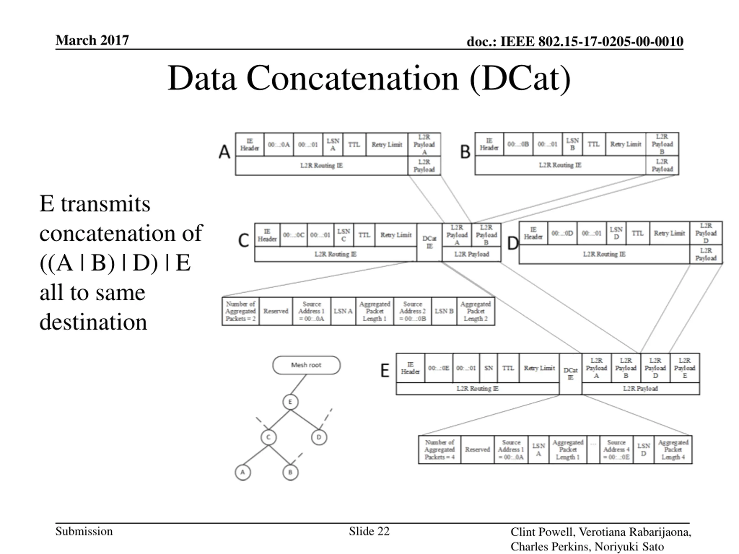 March 2017 doc.: IEEE 802.15-17-0205-00-0010 Data Concatenation (DCat) E transmits concatenation of ((A | B) | D) | E all to same destination Submission Slide 22 Clint Powell, Verotiana Rabarijaona, Charles Perkins, Noriyuki Sato