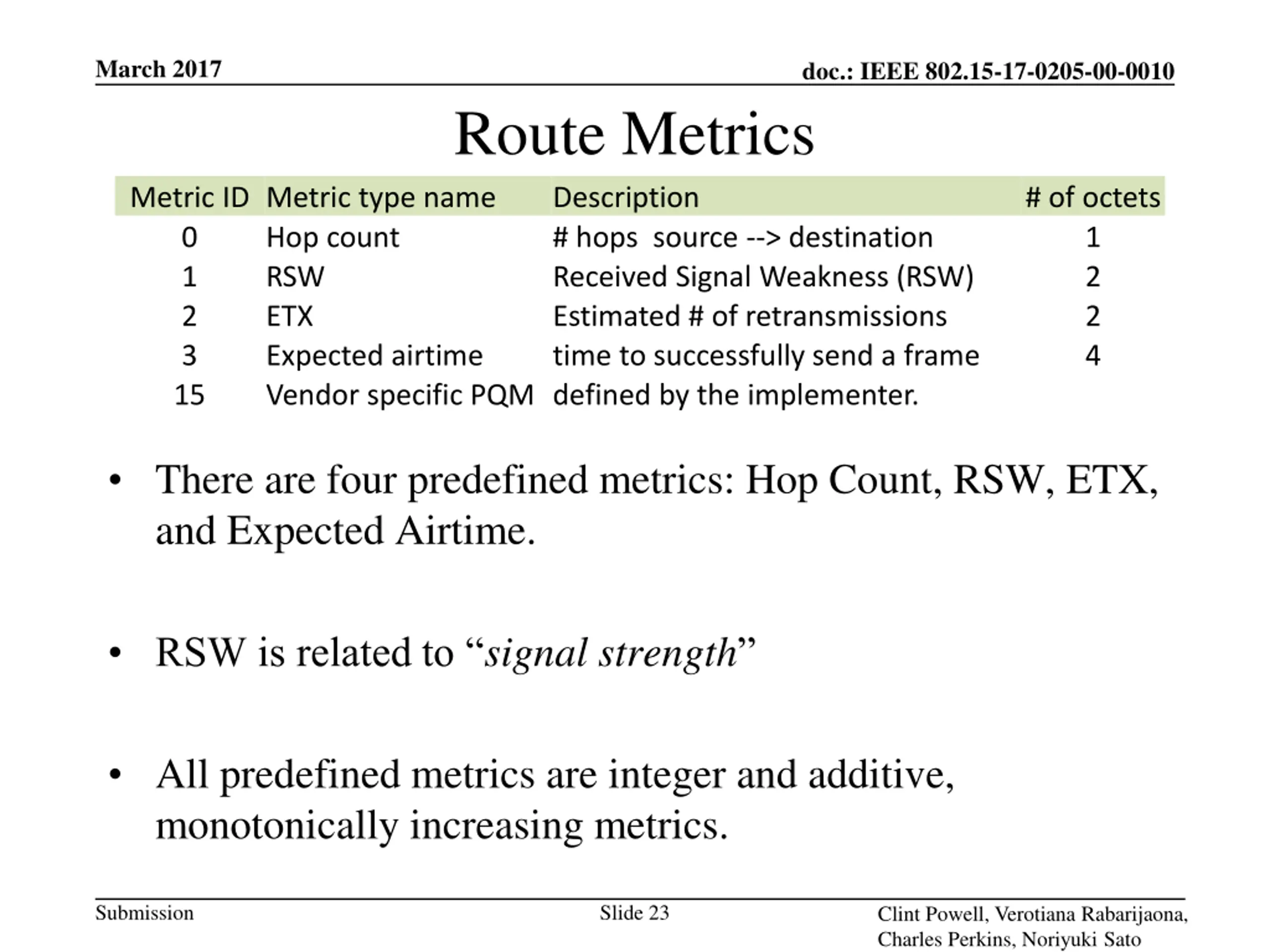 March 2017 doc.: IEEE 802.15-17-0205-00-0010 Route Metrics Description # hops source --> destination Received Signal Weakness (RSW) Estimated # of retransmissions Expected airtime time to successfully send a frame Vendor specific PQM defined by the implementer. Metric ID Metric type name 0 Hop count 1 RSW 2 ETX 3 15 # of octets 1 2 2 4 There are four predefined metrics: Hop Count, RSW, ETX, and Expected Airtime. RSW is related to signal strength All predefined metrics are integer and additive, monotonically increasing metrics. Submission Slide 23 Clint Powell, Verotiana Rabarijaona, Charles Perkins, Noriyuki Sato