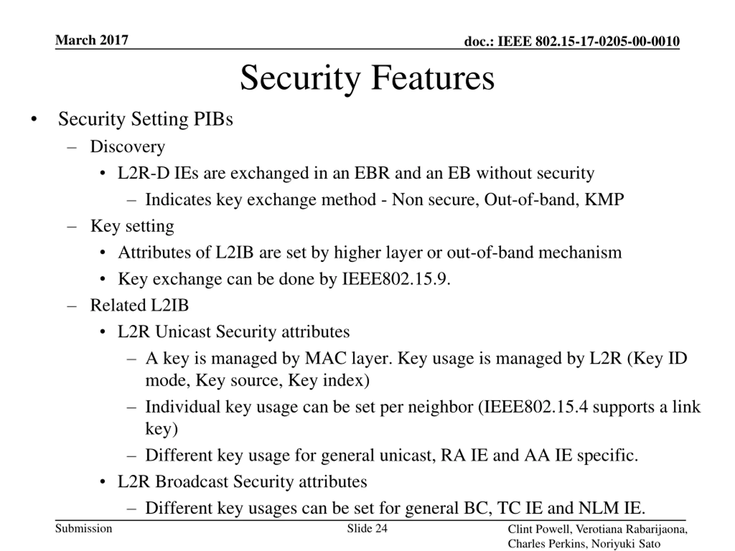 March 2017 doc.: IEEE 802.15-17-0205-00-0010 Security Features Security Setting PIBs Discovery L2R-D IEs are exchanged in an EBR and an EB without security Indicates key exchange method - Non secure, Out-of-band, KMP Key setting Attributes of L2IB are set by higher layer or out-of-band mechanism Key exchange can be done by IEEE802.15.9. Related L2IB L2R Unicast Security attributes A key is managed by MAC layer. Key usage is managed by L2R (Key ID mode, Key source, Key index) Individual key usage can be set per neighbor (IEEE802.15.4 supports a link key) Different key usage for general unicast, RA IE and AA IE specific. L2R Broadcast Security attributes Different key usages can be set for general BC, TC IE and NLM IE. Submission Slide 24 Clint Powell, Verotiana Rabarijaona, Charles Perkins, Noriyuki Sato