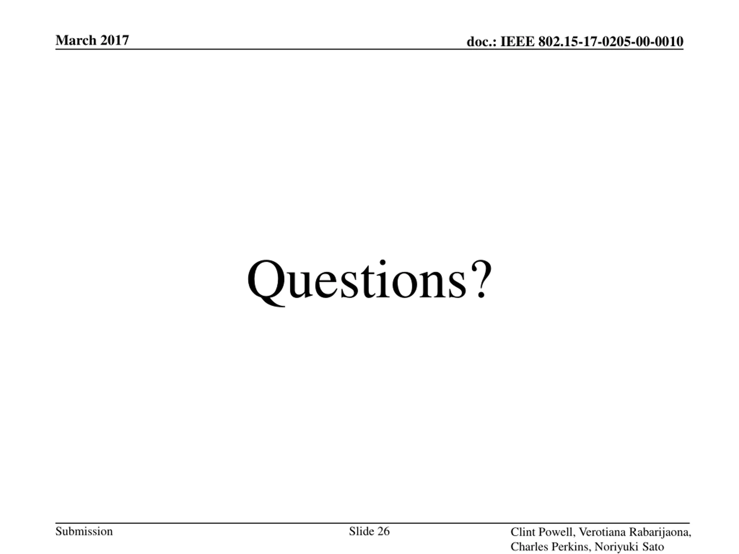 March 2017 doc.: IEEE 802.15-17-0205-00-0010 Questions? Submission Slide 26 Clint Powell, Verotiana Rabarijaona, Charles Perkins, Noriyuki Sato