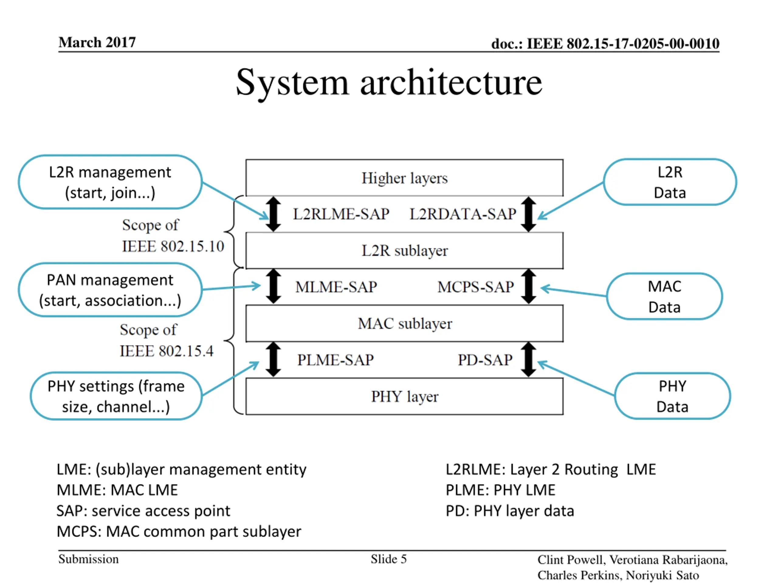March 2017 doc.: IEEE 802.15-17-0205-00-0010 System architecture L2R management (start, join...) L2R Data PAN management (start, association...) MAC Data PHY settings (frame size, channel...) PHY Data LME: (sub)layer management entity MLME: MAC LME SAP: service access point MCPS: MAC common part sublayer L2RLME: Layer 2 Routing LME PLME: PHY LME PD: PHY layer data Submission Slide 5 Clint Powell, Verotiana Rabarijaona, Charles Perkins, Noriyuki Sato