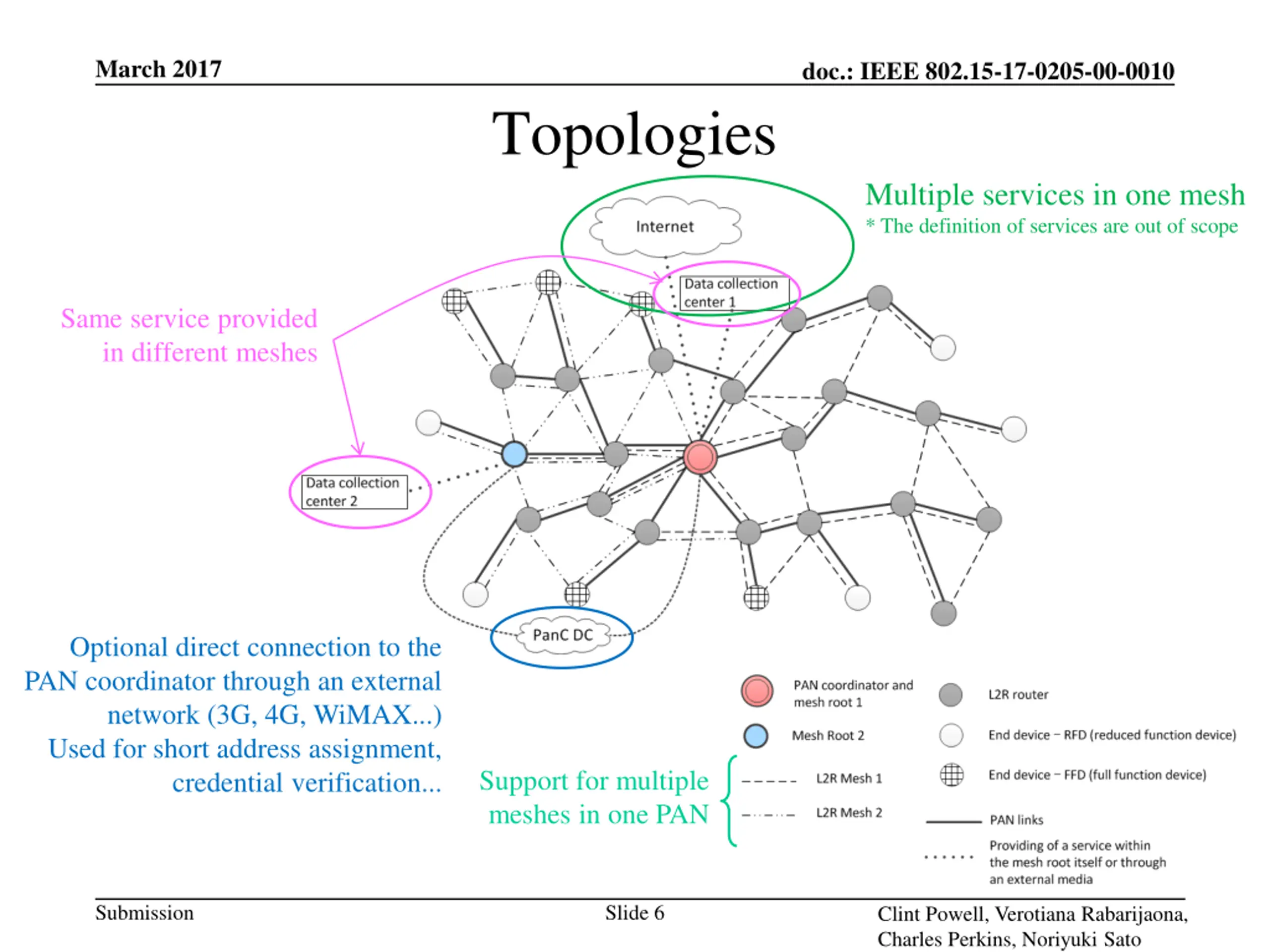 March 2017 doc.: IEEE 802.15-17-0205-00-0010 Topologies Multiple services in one mesh * The definition of services are out of scope Same service provided in different meshes Optional direct connection to the PAN coordinator through an external network (3G, 4G, WiMAX...) Used for short address assignment, credential verification... Support for multiple meshes in one PAN Submission Slide 6 Clint Powell, Verotiana Rabarijaona, Charles Perkins, Noriyuki Sato