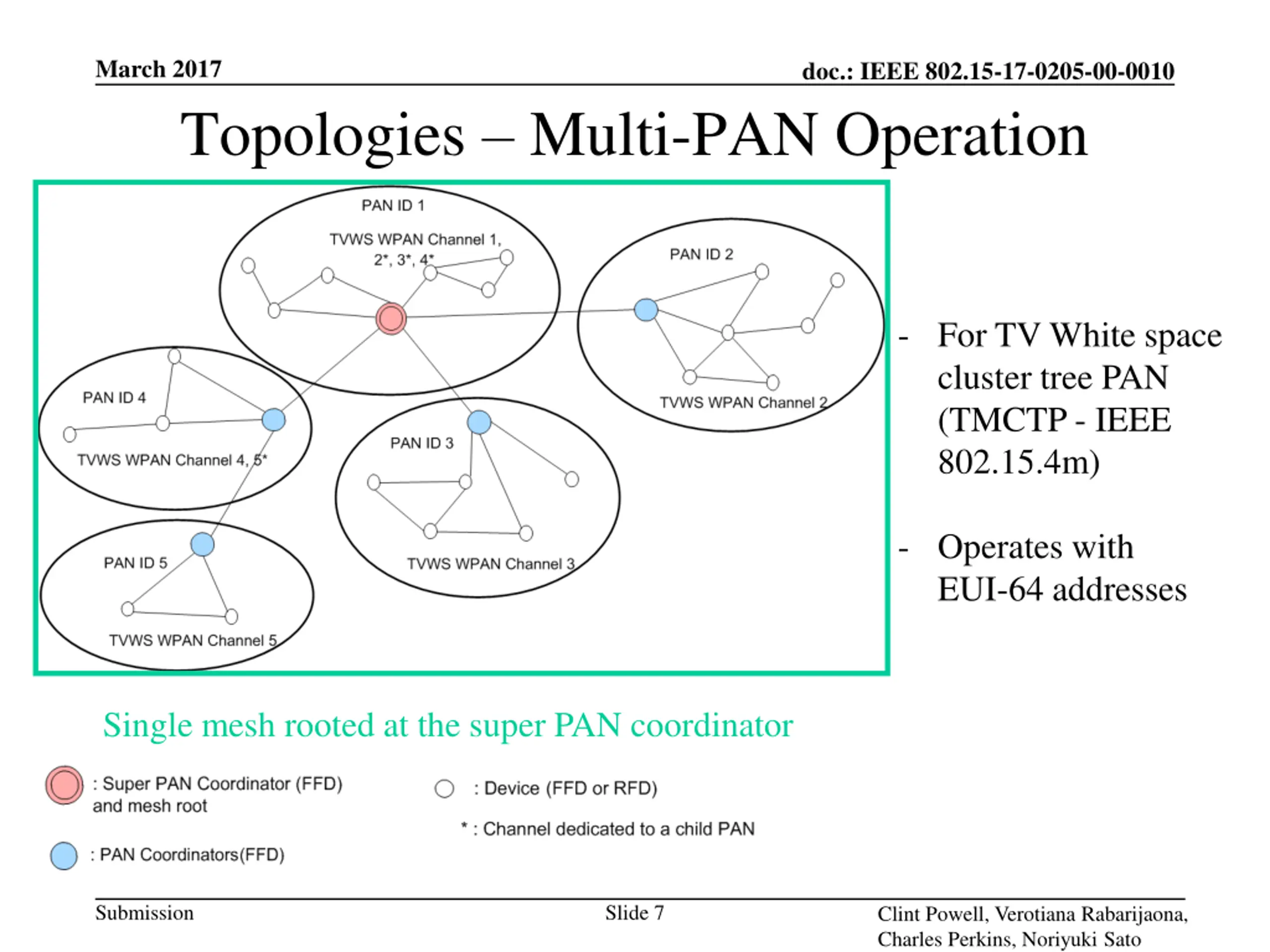 March 2017 doc.: IEEE 802.15-17-0205-00-0010 Topologies Multi-PAN Operation - For TV White space cluster tree PAN (TMCTP - IEEE 802.15.4m) - Operates with EUI-64 addresses Single mesh rooted at the super PAN coordinator Submission Slide 7 Clint Powell, Verotiana Rabarijaona, Charles Perkins, Noriyuki Sato