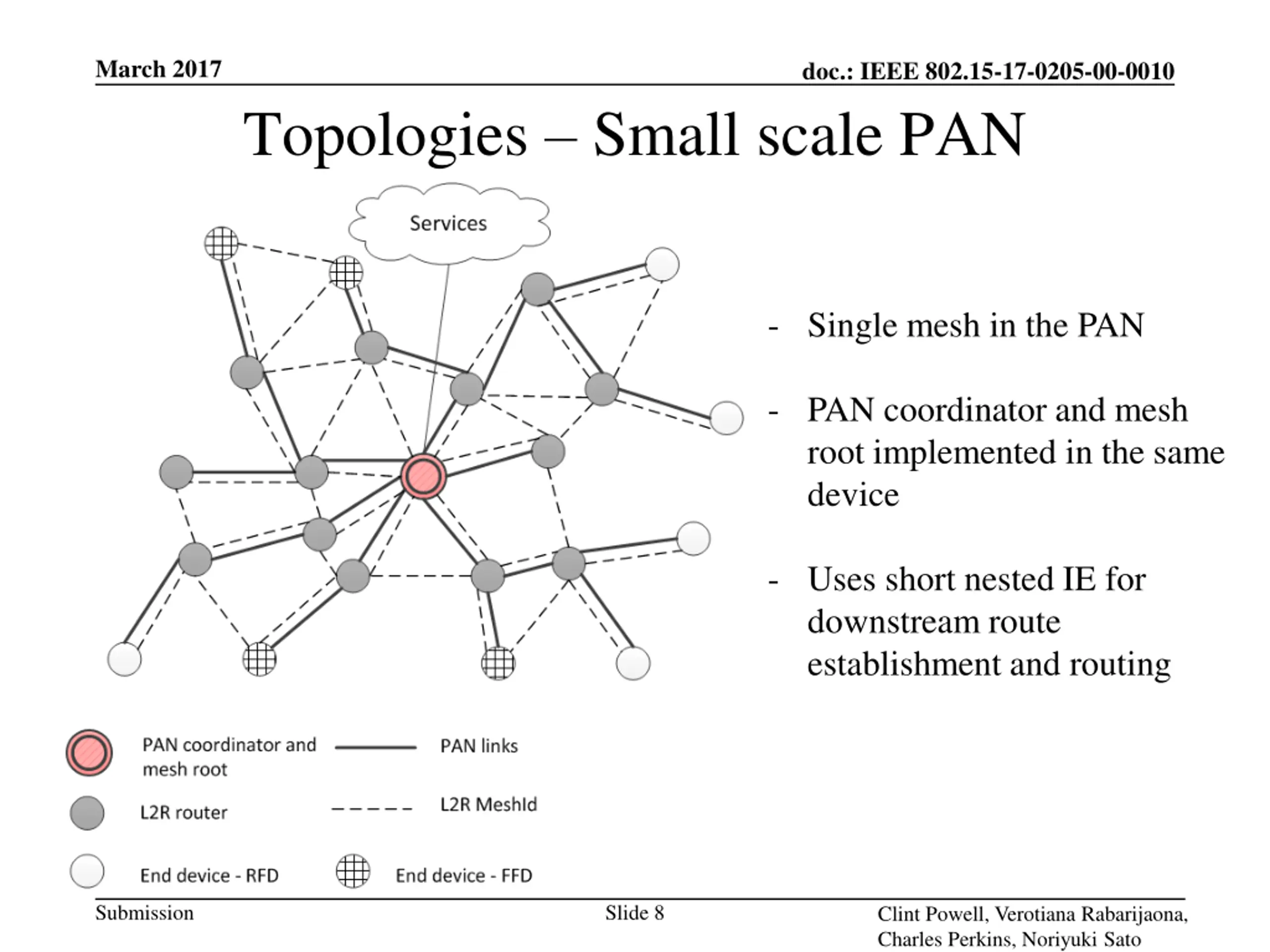 March 2017 doc.: IEEE 802.15-17-0205-00-0010 Topologies Small scale PAN - Single mesh in the PAN - PAN coordinator and mesh root implemented in the same device - Uses short nested IE for downstream route establishment and routing Submission Slide 8 Clint Powell, Verotiana Rabarijaona, Charles Perkins, Noriyuki Sato