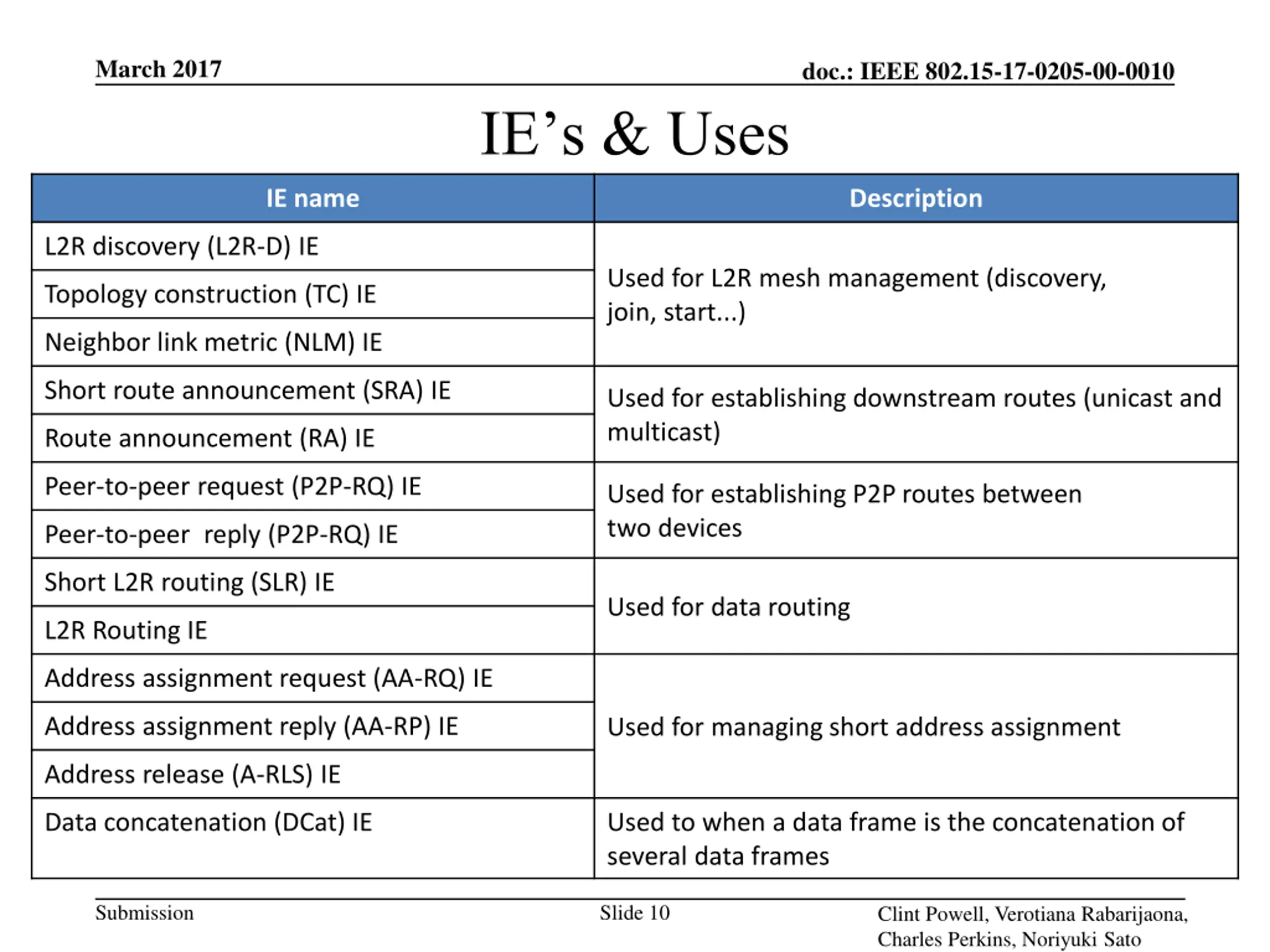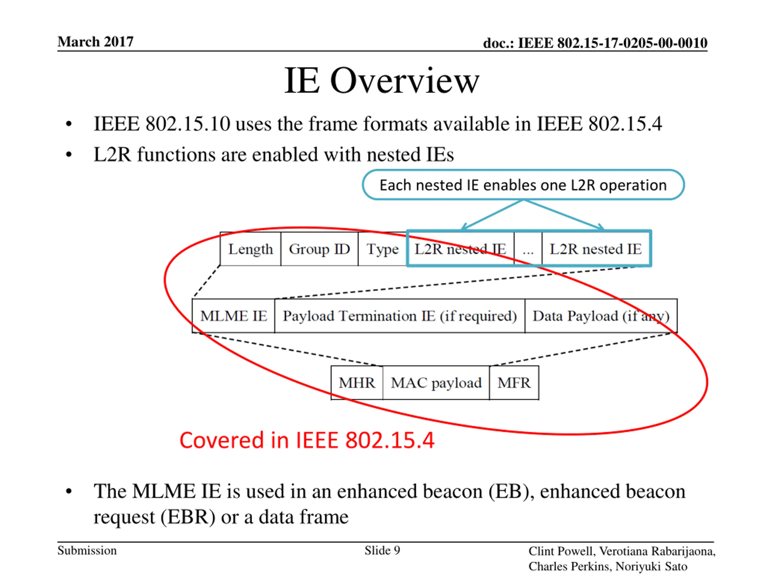 March 2017 doc.: IEEE 802.15-17-0205-00-0010 IE Overview IEEE 802.15.10 uses the frame formats available in IEEE 802.15.4 L2R functions are enabled with nested IEs Each nested IE enables one L2R operation Covered in IEEE 802.15.4 The MLME IE is used in an enhanced beacon (EB), enhanced beacon request (EBR) or a data frame Submission Slide 9 Clint Powell, Verotiana Rabarijaona, Charles Perkins, Noriyuki Sato