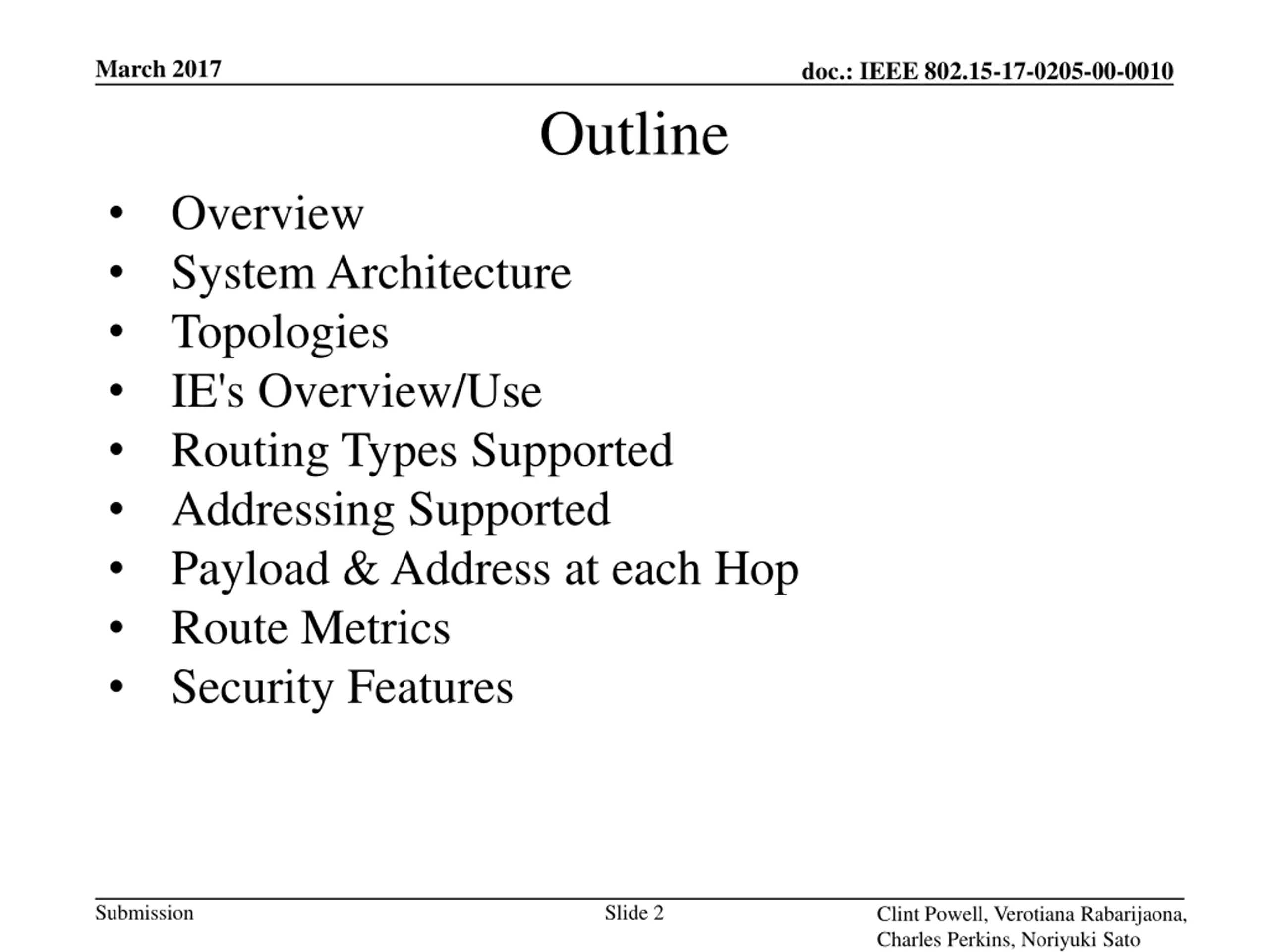 March 2017 doc.: IEEE 802.15-17-0205-00-0010 Outline Overview System Architecture Topologies IE's Overview/Use Routing Types Supported Addressing Supported Payload & Address at each Hop Route Metrics Security Features Submission Slide 2 Clint Powell, Verotiana Rabarijaona, Charles Perkins, Noriyuki Sato