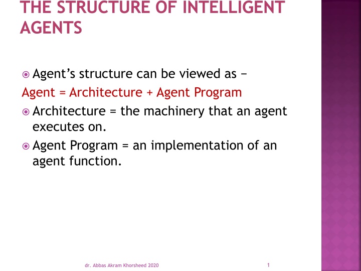 THE STRUCTURE OF INTELLIGENT AGENTS Agent s structure can be viewed as Agent = Architecture + Agent Program Architecture = the machinery that an agent executes on. Agent Program = an implementation of an agent function. 1 dr. Abbas Akram Khorsheed 2020