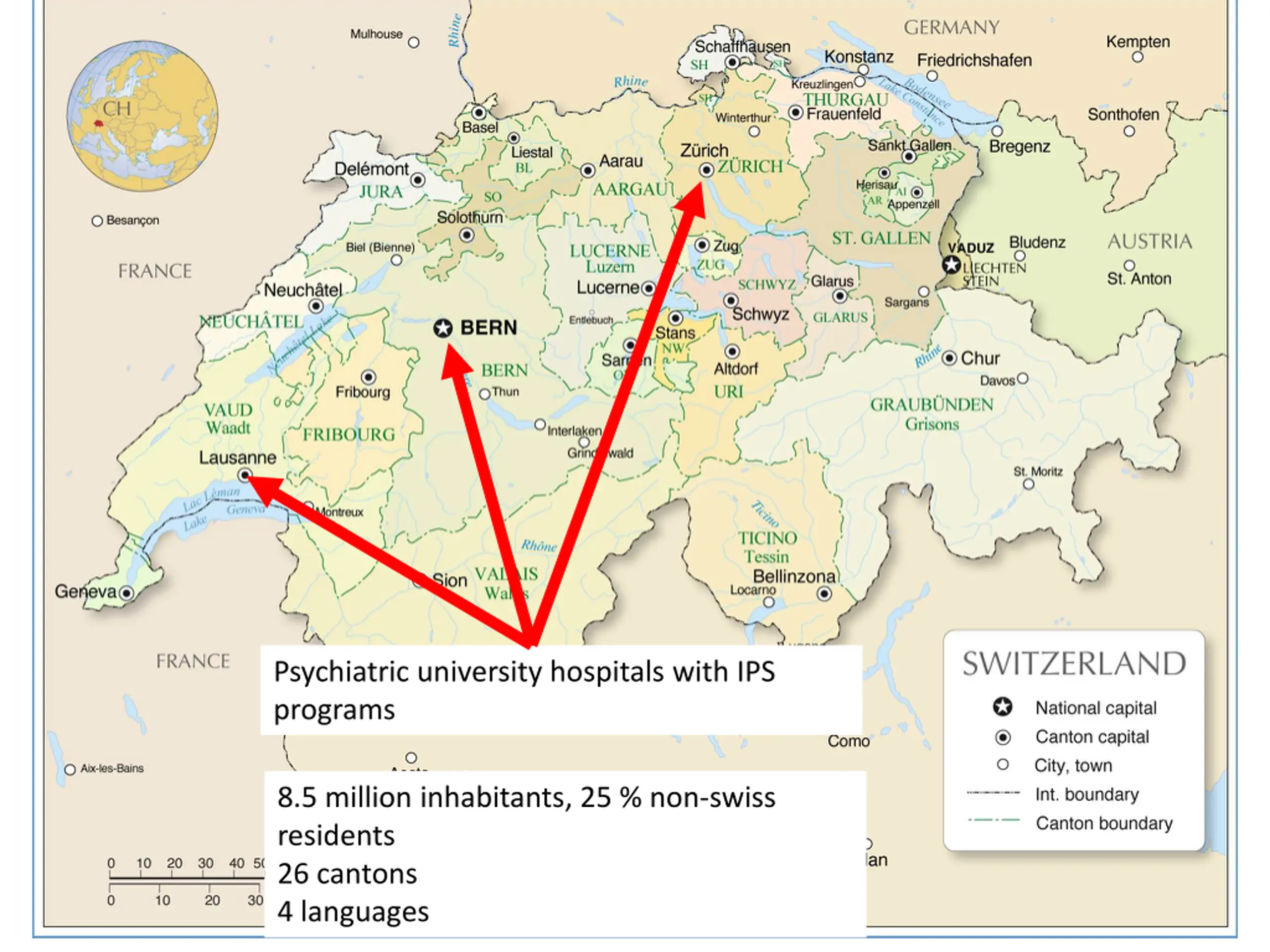 Psychiatric university hospitals with IPS programs 8.5 million inhabitants, 25 % non-swiss residents 26 cantons 4 languages
