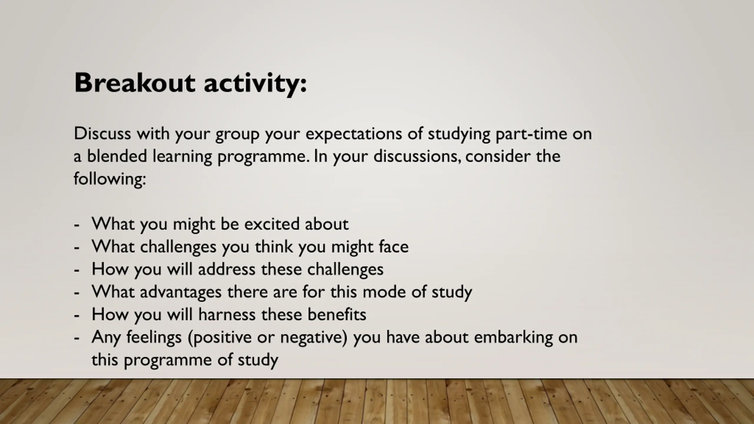 Breakout activity: Discuss with your group your expectations of studying part-time on a blended learning programme. In your discussions, consider the following: - What you might be excited about - What challenges you think you might face - How you will address these challenges - What advantages there are for this mode of study - How you will harness these benefits - Any feelings (positive or negative) you have about embarking on this programme of study