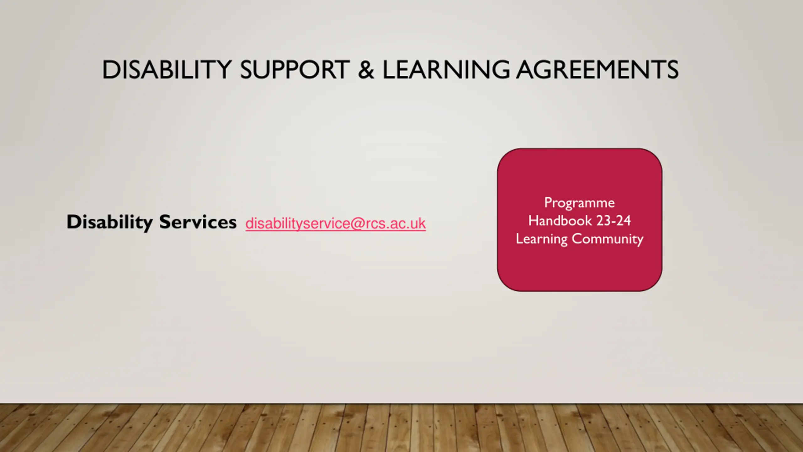 DISABILITY SUPPORT & LEARNING AGREEMENTS Programme Handbook 23-24 Learning Community Disability Services disabilityservice@rcs.ac.uk