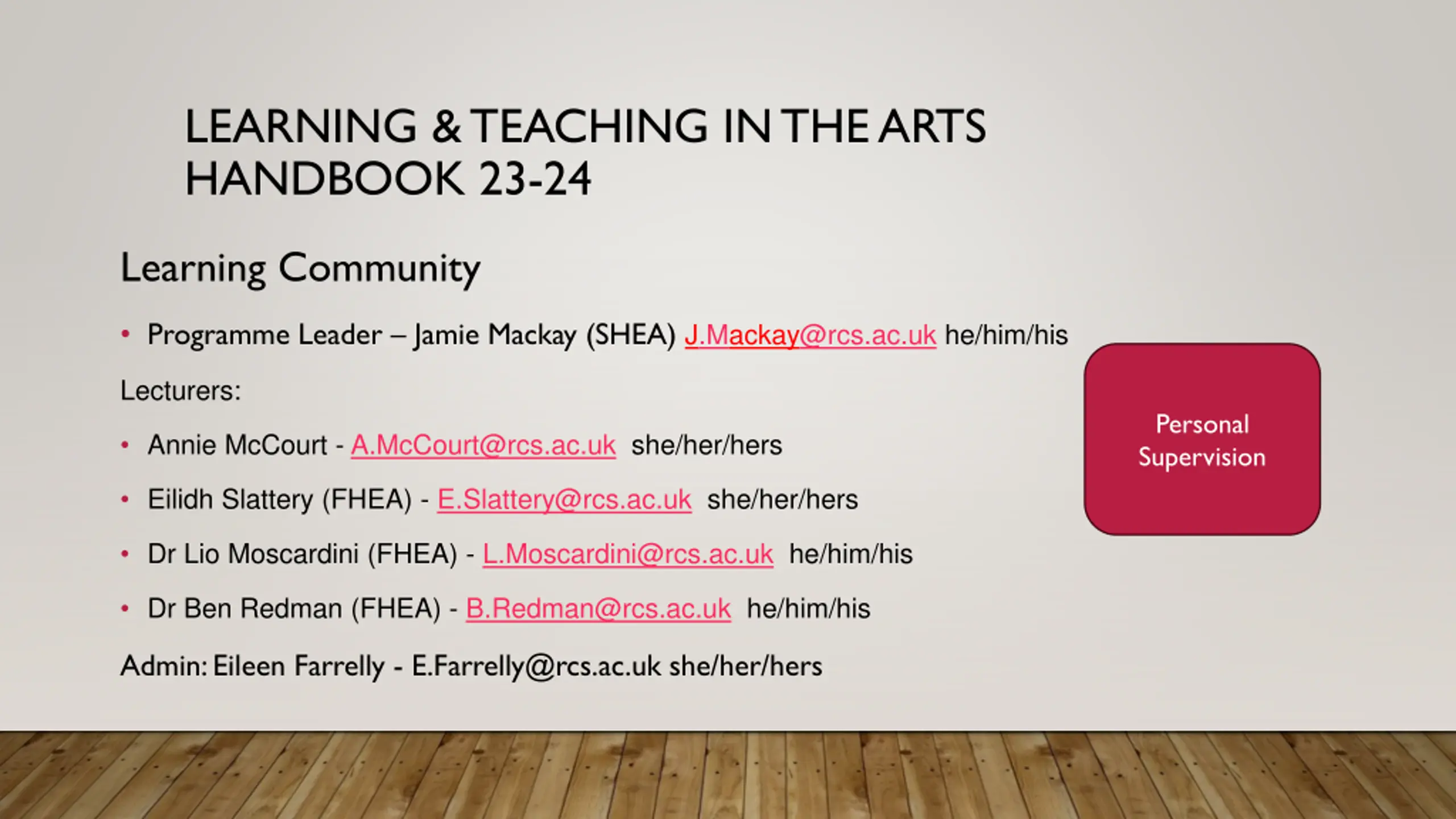 LEARNING & TEACHING IN THE ARTS HANDBOOK 23-24 Learning Community Programme Leader Jamie Mackay (SHEA) J.Mackay@rcs.ac.uk he/him/his Lecturers: Personal Supervision Annie McCourt - A.McCourt@rcs.ac.uk she/her/hers Eilidh Slattery (FHEA) - E.Slattery@rcs.ac.uk she/her/hers Dr Lio Moscardini (FHEA) - L.Moscardini@rcs.ac.uk he/him/his Dr Ben Redman (FHEA) - B.Redman@rcs.ac.uk he/him/his Admin: Eileen Farrelly - E.Farrelly@rcs.ac.uk she/her/hers
