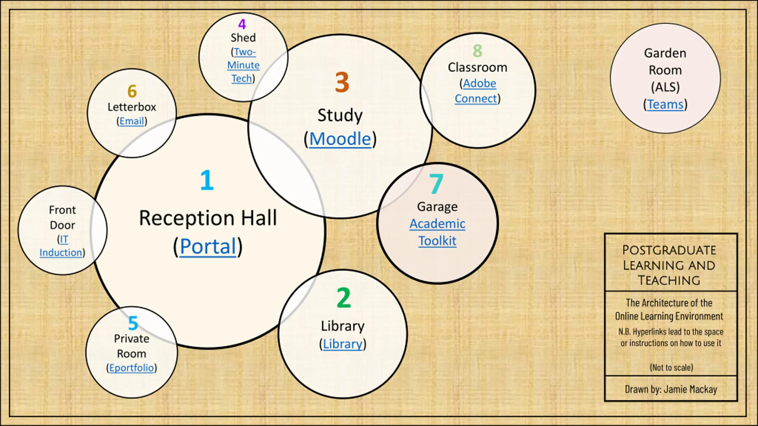 4 Shed (Two- Minute Tech) 8 Garden Room (ALS) (Teams) Classroom (Adobe Connect) 3 6 Letterbox (Email) Study (Moodle) 1 7 Garage Academic Toolkit Front Door (IT Induction) Reception Hall (Portal) Postgraduate Postgraduate Learning and Learning and Teaching Teaching 2 The Architecture of the Online Learning Environment N.B. Hyperlinks lead to the space or instructions on how to use it 5 Library (Library) Private Room (Eportfolio) (Not to scale) Drawn by: Jamie Mackay