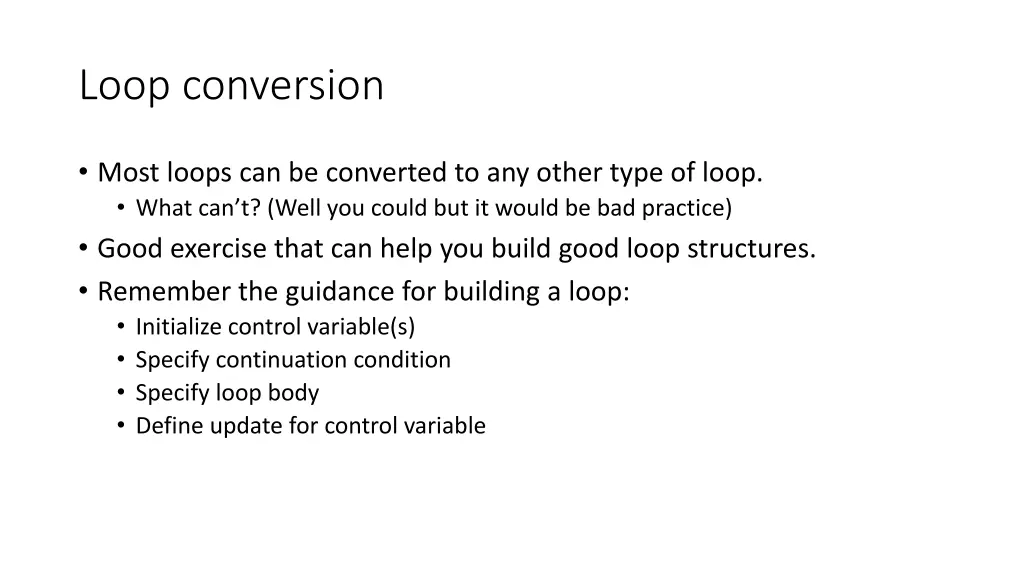 Loop conversion Most loops can be converted to any other type of loop. What can t? (Well you could but it would be bad practice) Good exercise that can help you build good loop structures. Remember the guidance for building a loop: Initialize control variable(s) Specify continuation condition Specify loop body Define update for control variable