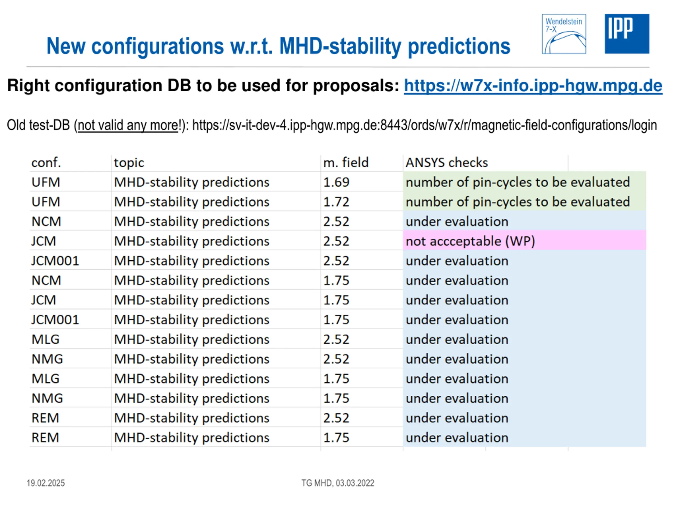 New configurations w.r.t. MHD-stability predictions Right configuration DB to be used for proposals: https://w7x-info.ipp-hgw.mpg.de Old test-DB (not valid any more!): https://sv-it-dev-4.ipp-hgw.mpg.de:8443/ords/w7x/r/magnetic-field-configurations/login 19.02.2025 TG MHD, 03.03.2022