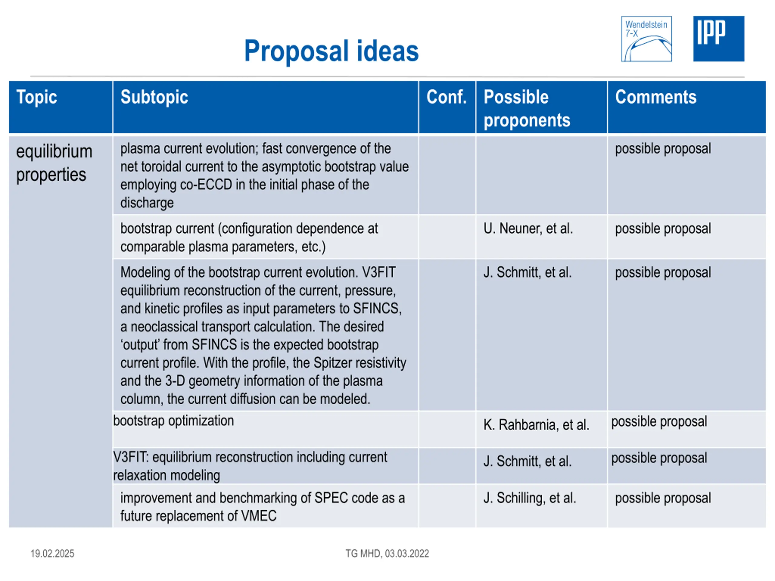 Proposal ideas Topic Subtopic Conf. Possible proponents Comments plasma current evolution; fast convergence of the net toroidal current to the asymptotic bootstrap value employing co-ECCD in the initial phase of the discharge possible proposal equilibrium properties bootstrap current (configuration dependence at comparable plasma parameters, etc.) U. Neuner, et al. possible proposal Modeling of the bootstrap current evolution. V3FIT equilibrium reconstruction of the current, pressure, and kinetic profiles as input parameters to SFINCS, a neoclassical transport calculation. The desired output from SFINCS is the expected bootstrap current profile. With the profile, the Spitzer resistivity and the 3-D geometry information of the plasma column, the current diffusion can be modeled. bootstrap optimization J. Schmitt, et al. possible proposal possible proposal K. Rahbarnia, et al. V3FIT: equilibrium reconstruction including current relaxation modeling improvement and benchmarking of SPEC code as a future replacement of VMEC possible proposal J. Schmitt, et al. J. Schilling, et al. possible proposal 19.02.2025 TG MHD, 03.03.2022