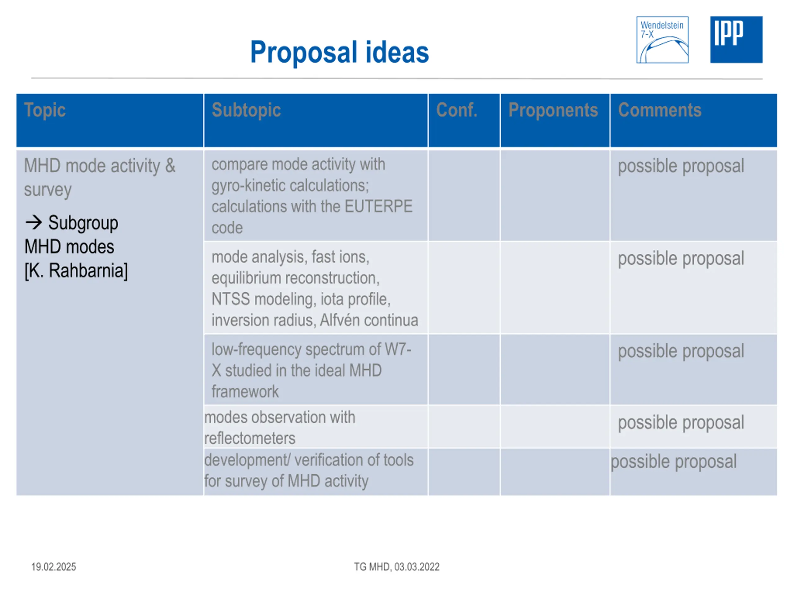 Proposal ideas Topic Subtopic Conf. Proponents Comments Reversed field experiments Tespel / Impurity distribution dynamics Reversal of ExB rotation/ drifts possible proposal possible proposal Bootstrap current and residual ECCD / NBCD Alfvenic mode activity possible proposal possible proposal High performance in reversed field/ density crash ECCD in reversed field vs. normal field possible proposal possible proposal 19.02.2025 TG MHD, 03.03.2022