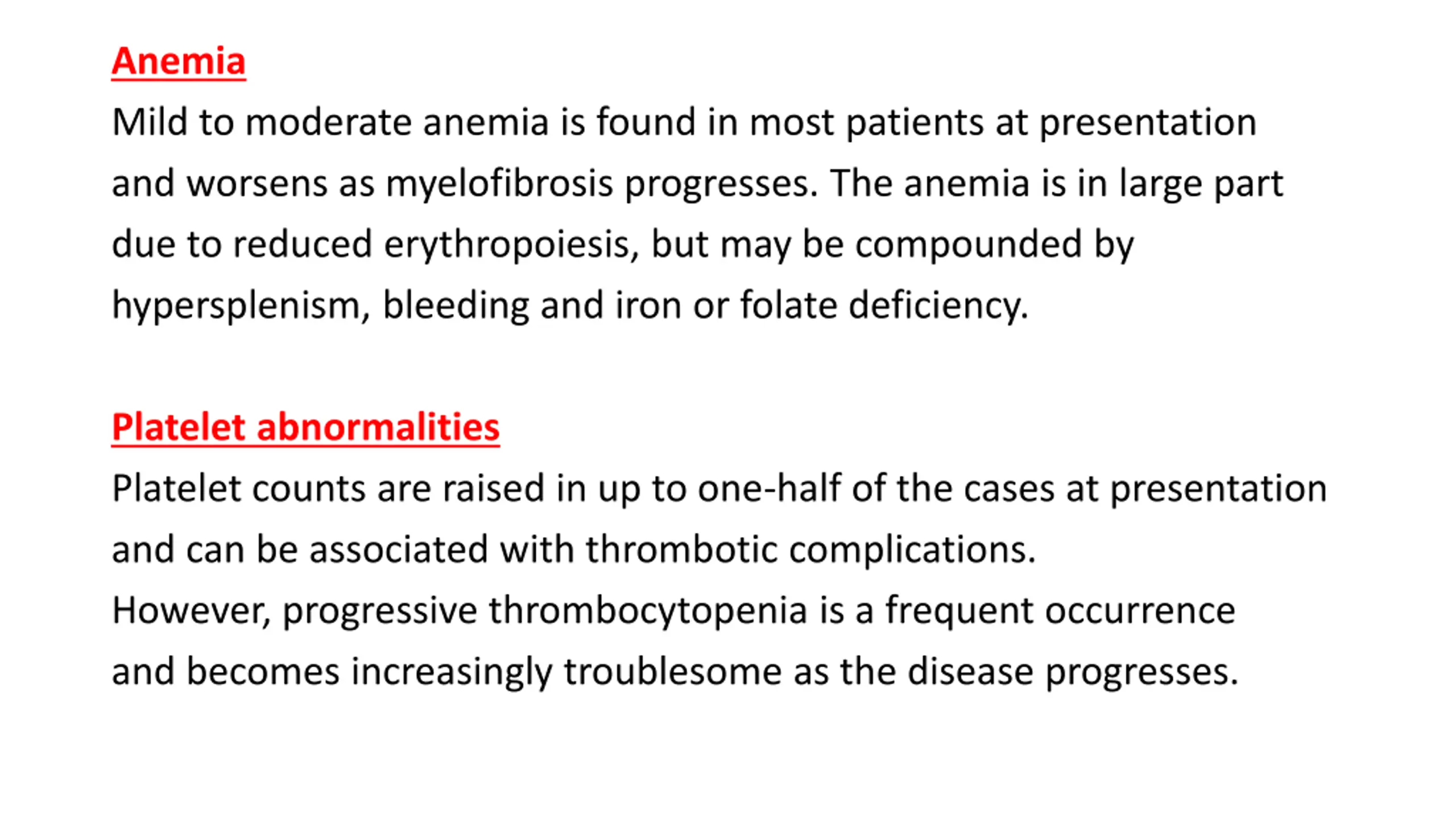 Anemia Mild to moderate anemia is found in most patients at presentation and worsens as myelofibrosis progresses. The anemia is in large part due to reduced erythropoiesis, but may be compounded by hypersplenism, bleeding and iron or folate deficiency. Platelet abnormalities Platelet counts are raised in up to one-half of the cases at presentation and can be associated with thrombotic complications. However, progressive thrombocytopenia is a frequent occurrence and becomes increasingly troublesome as the disease progresses.