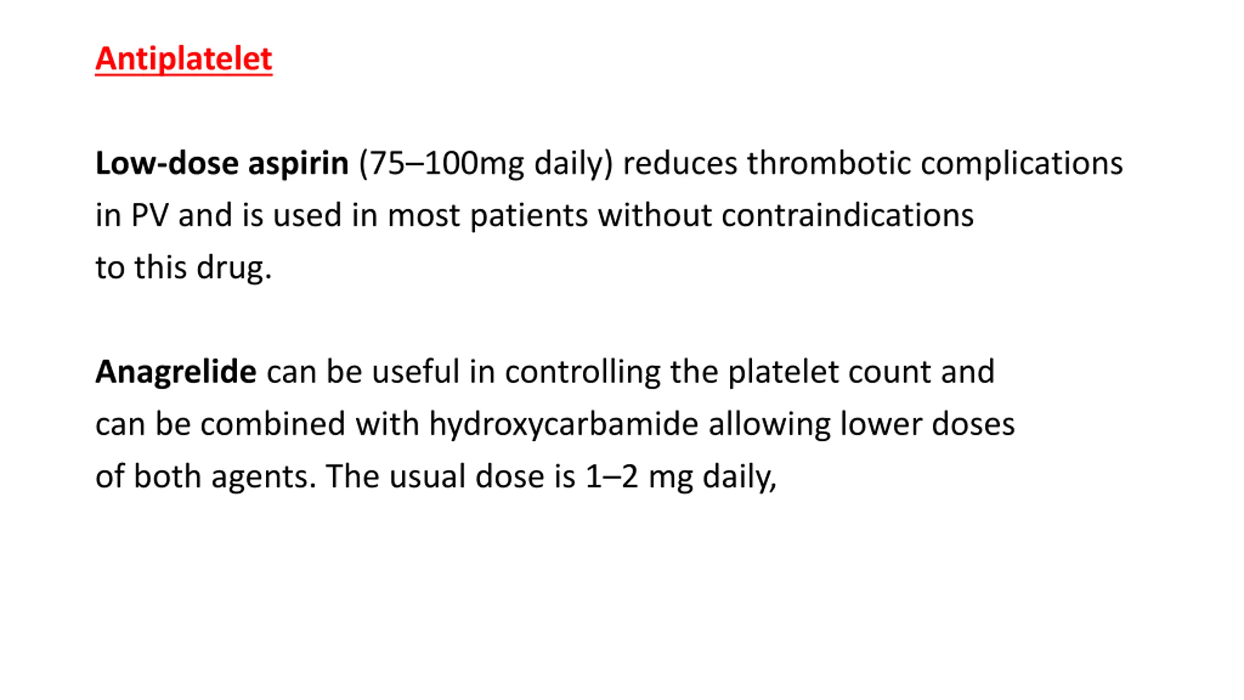 Antiplatelet Low-dose aspirin (75 100mg daily) reduces thrombotic complications in PV and is used in most patients without contraindications to this drug. Anagrelide can be useful in controlling the platelet count and can be combined with hydroxycarbamide allowing lower doses of both agents. The usual dose is 1 2 mg daily,