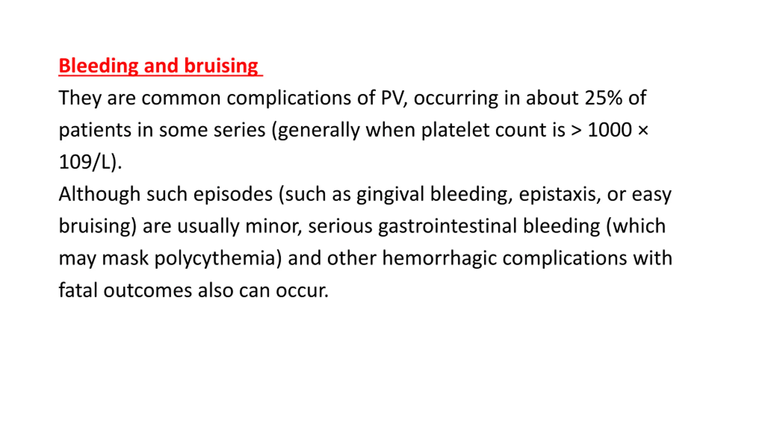 Bleeding and bruising They are common complications of PV, occurring in about 25% of patients in some series (generally when platelet count is > 1000 109/L). Although such episodes (such as gingival bleeding, epistaxis, or easy bruising) are usually minor, serious gastrointestinal bleeding (which may mask polycythemia) and other hemorrhagic complications with fatal outcomes also can occur.